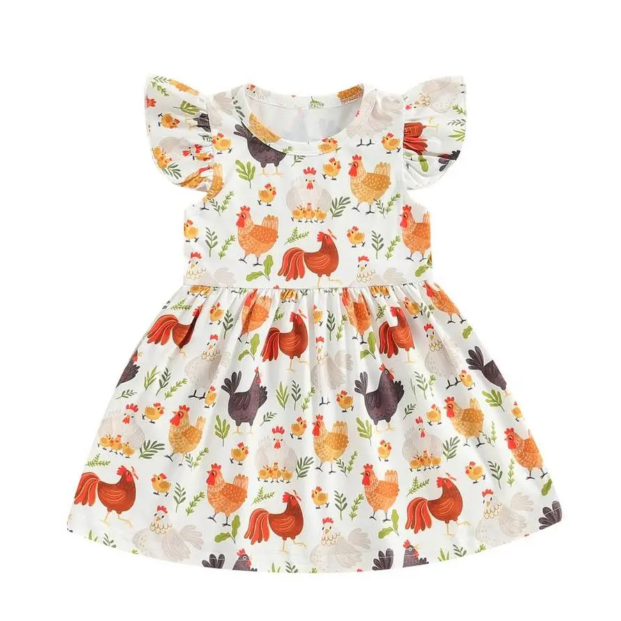 Toddler Girls Dress Farm Rooster Hen Print Fly Sleeve Crew Neck Baby Dress Summer Casual Princess Dres