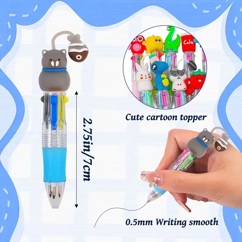 This set comes with 20 pieces of random mini 4-in-1 multicolor ballpoint pens, designed in cute and kawaii styles perfect for kids and students. Each pen combines 4 bright ink colors in one compact body, making writing, drawing, note-taking and coloring more fun and convenient.