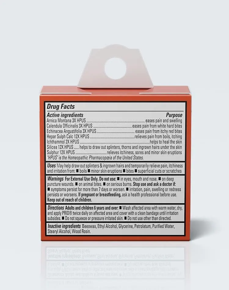·For over 50 years, PRID has been a must-have in both the family medicine chest and the tool box. PRID drawing salve helps draw out irritations from under the skin caused by splinters, boils, thorns, ingrown hairs, bug bites and more. It provides temporary topical relief of pain and irritations associated with boils, minor skin eruptions and redness.* PRID is a homeopathic formula with natural active ingredients. * Claims based on traditional homeopathic practice, not accepted medical evidence. Not FDA evaluated.