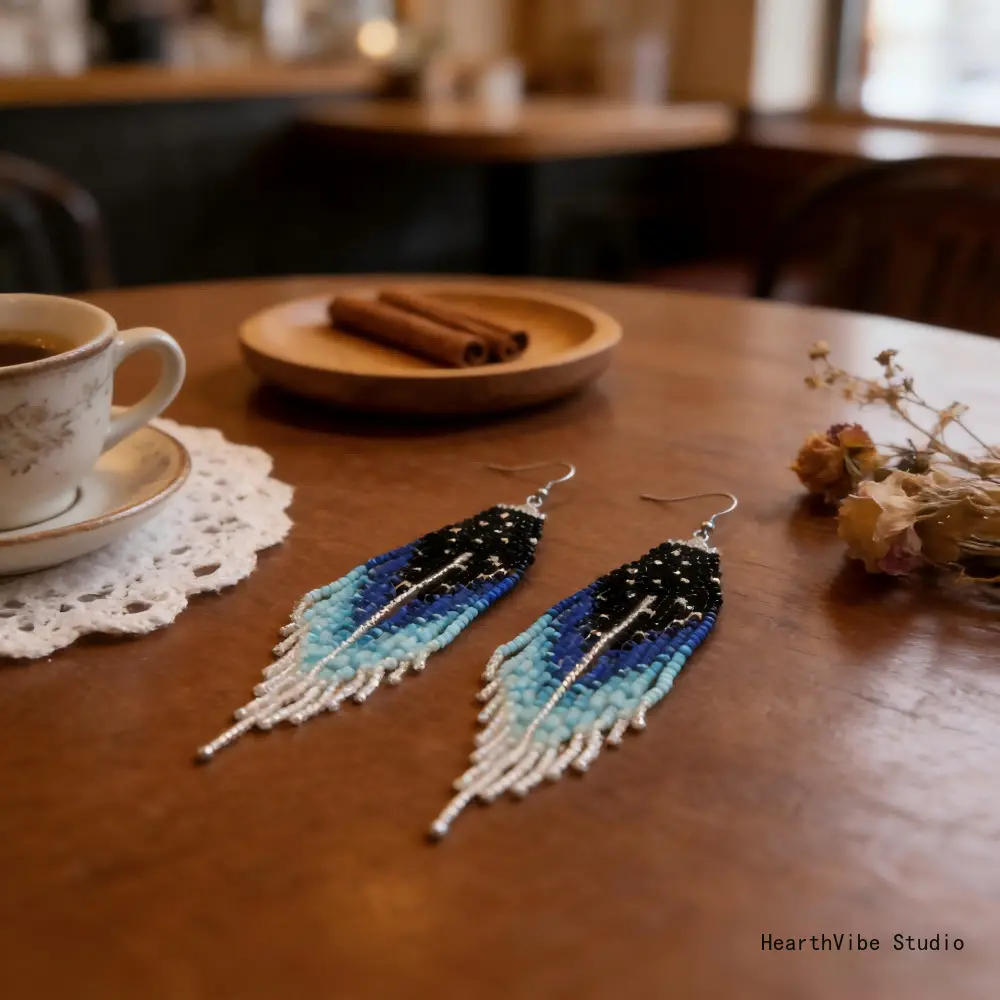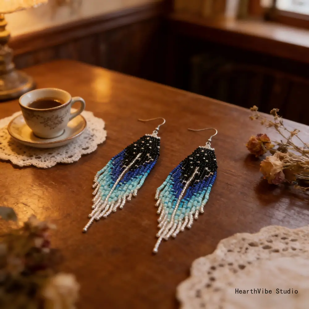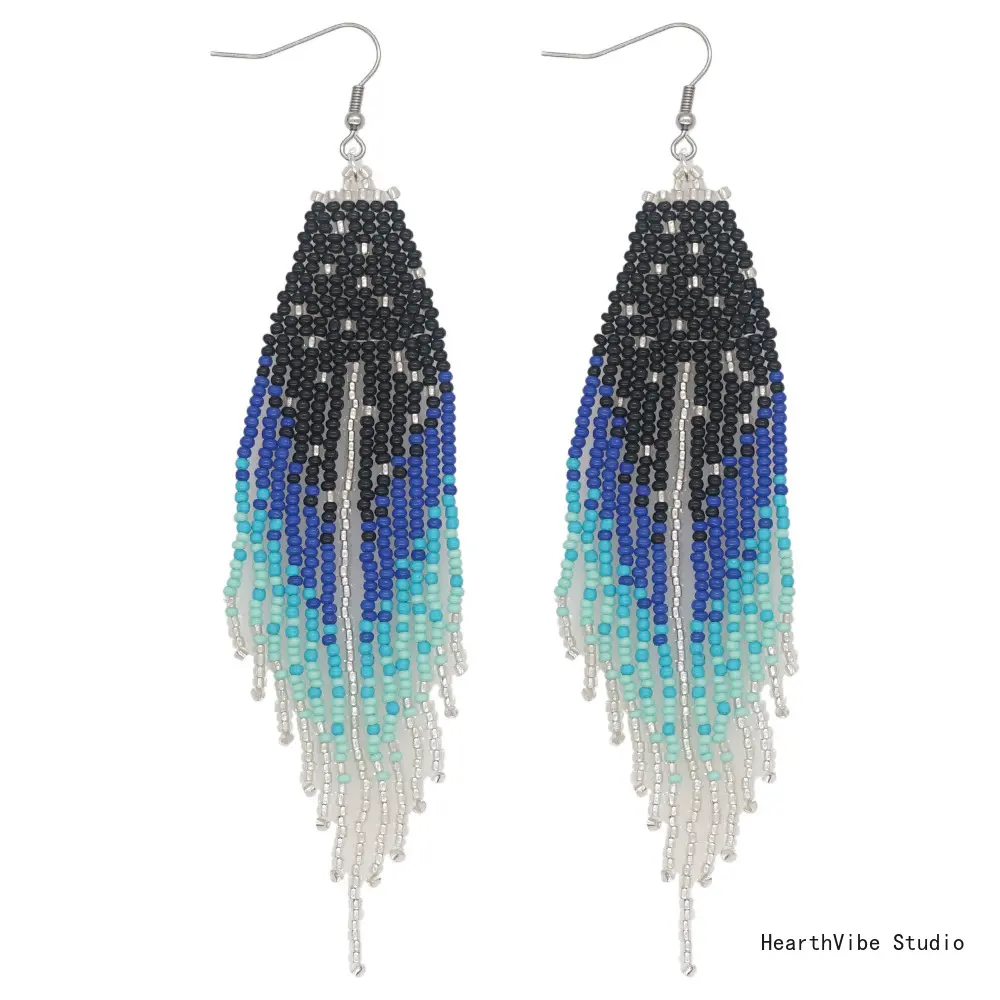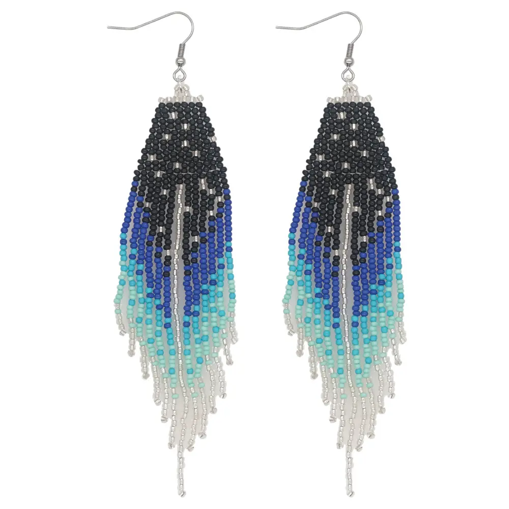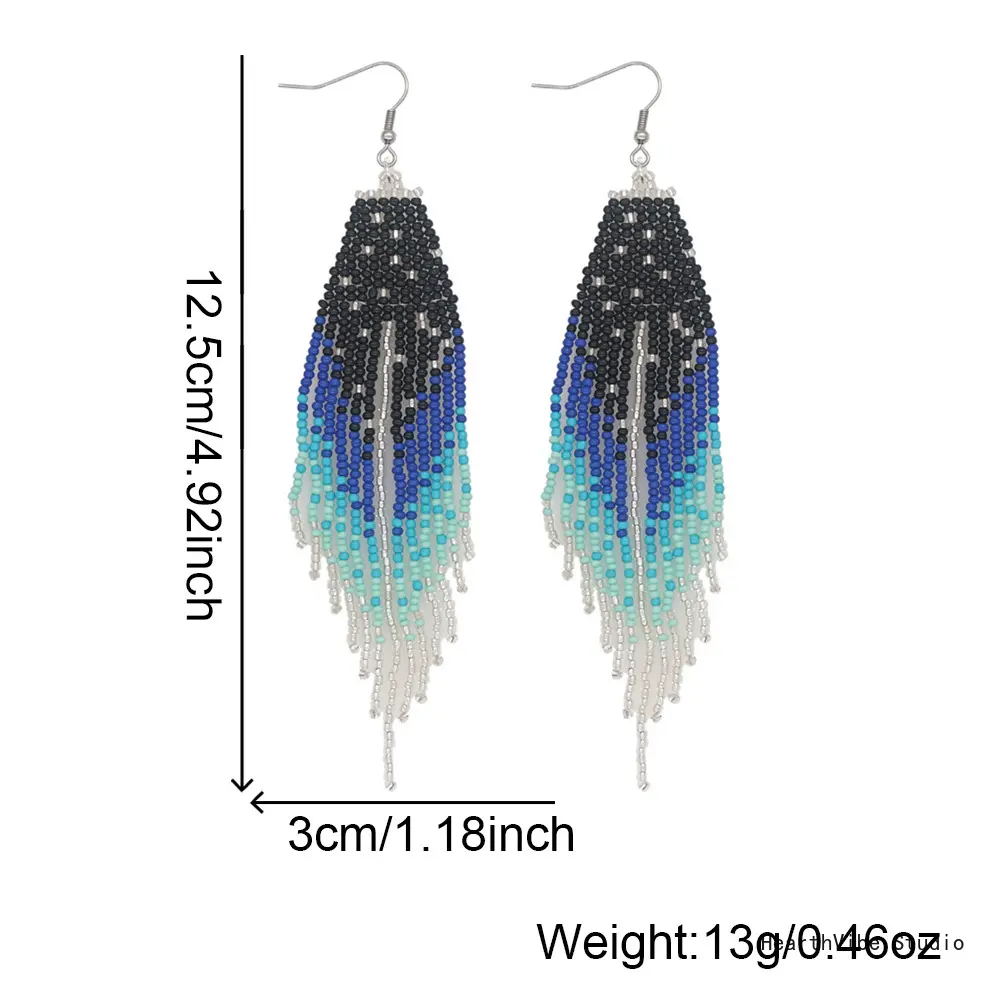 Women's Long Dangle Earrings: Handcrafted, Beaded, and Woven—Featuring a Gradient Blue-to-Black Seed Bead Tassel Design—Perfect for Street Style and Creating a Captivating "Vibe" for Photos