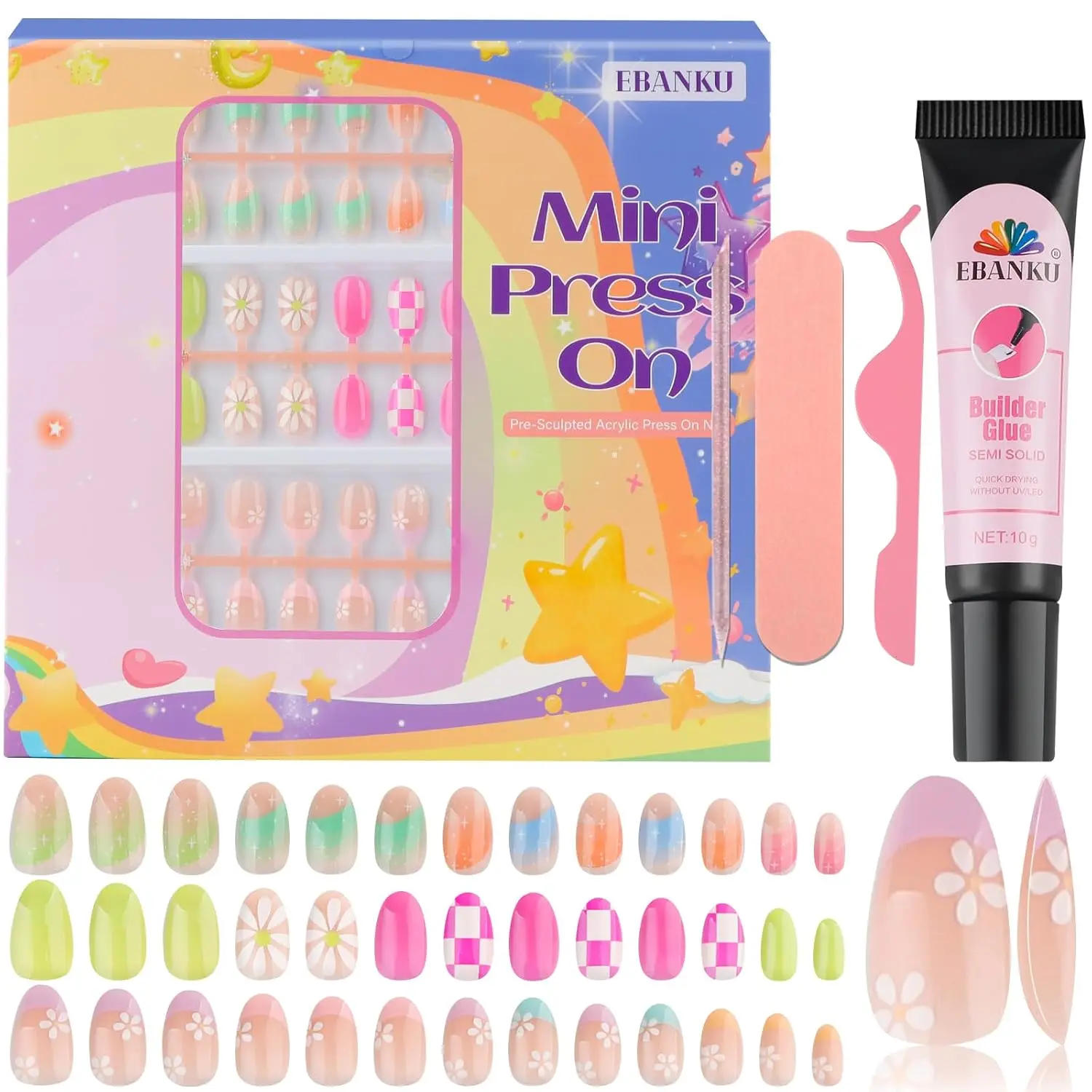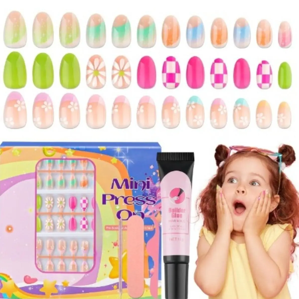 ·Easy to Use: Use with jelly nail adhesives or nail builder glue, no UV light required. You can choose fake nail of different sizes according to the shape and size of your girl's nails, and stick our false nails according to the nail shape.