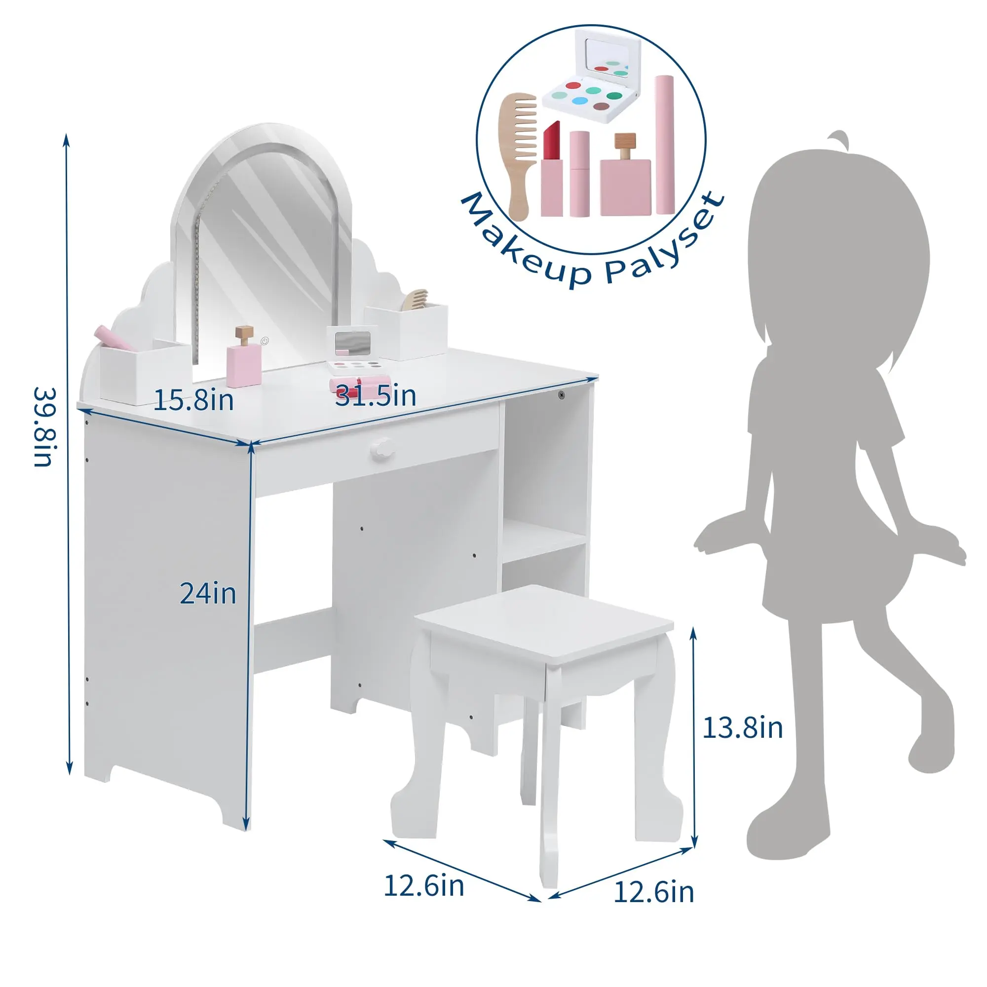 ·The girls' vanity set includes a desk, stool, and wooden makeup playset. It features a lighted mirror for checking makeup, drawer and 2 storage grid to store favorite accessories, and 2-tier open racks for cosmetics, toys, books, and personal items.