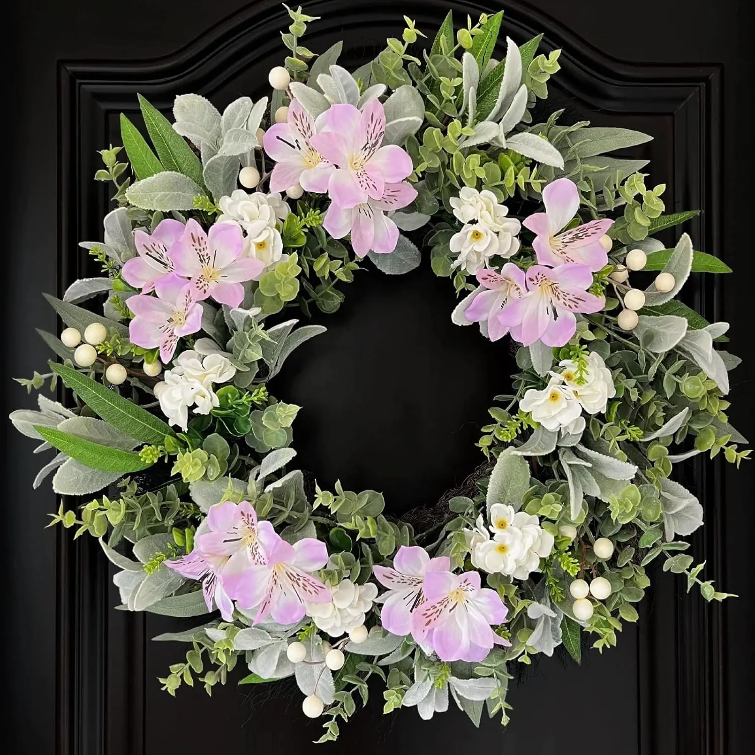 Front Door Wreath, Eucalyptus Leaf Wreath with Flowers and Berries, All-Season Greenery, Farmhouse Home Decor, Indoor Outdoor