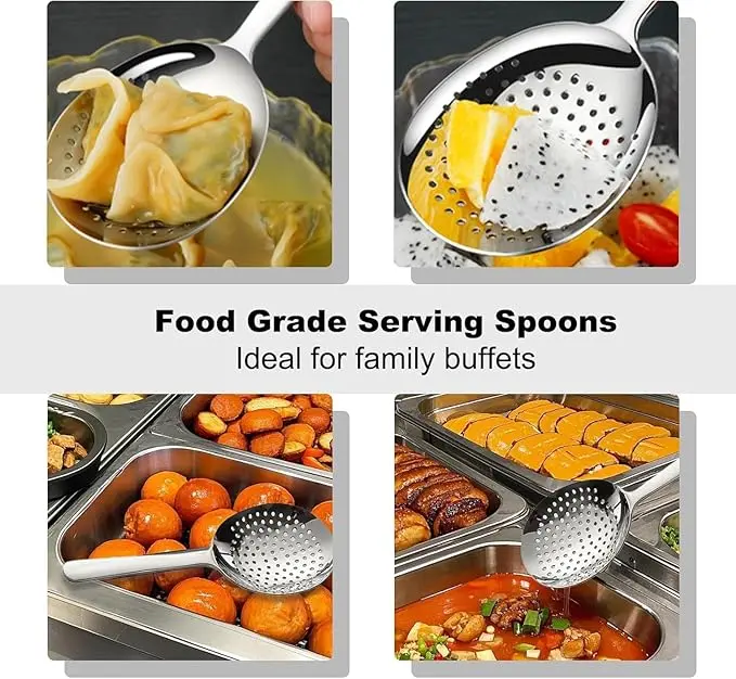 This set is versatile for various dishes. The Serving Ladle Spoon and Skimmer with a hole are essential for Korean Mukbang and Ramen. Enjoy your meals with style and functionality. No additional features or claims are made.