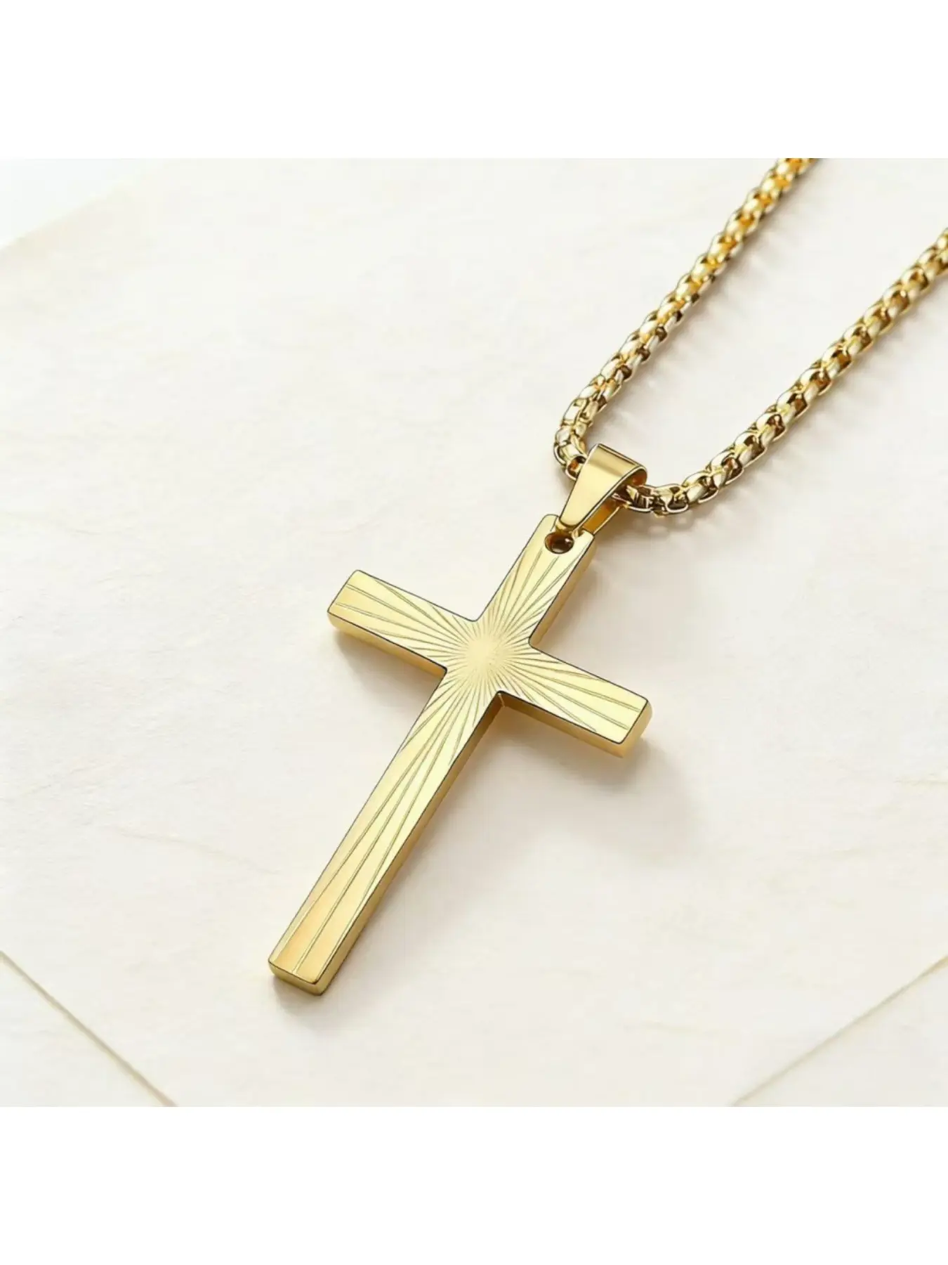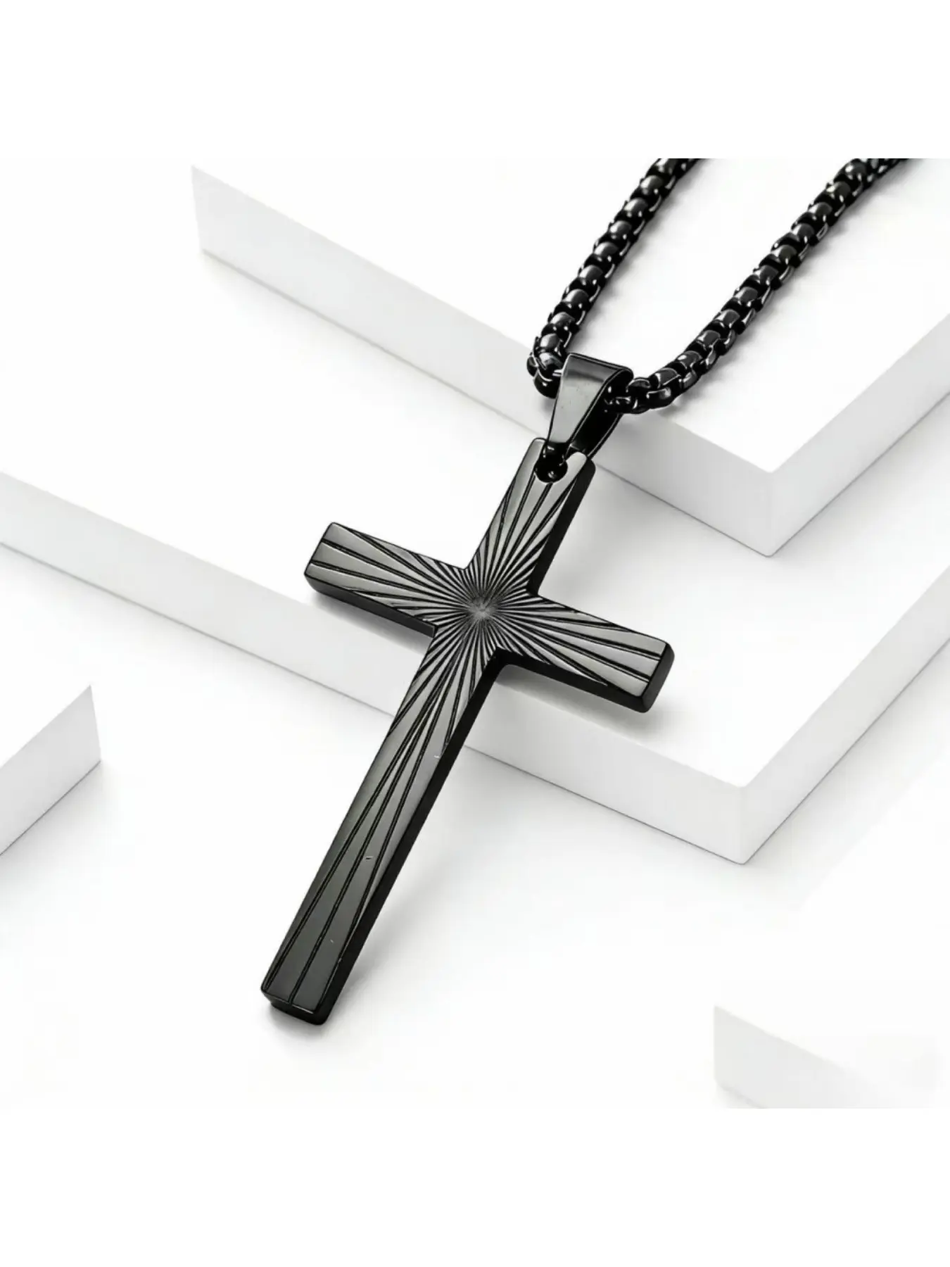 Sunburst Cross Pendant Necklace - Stainless Steel Titanium Chain for Men/Women