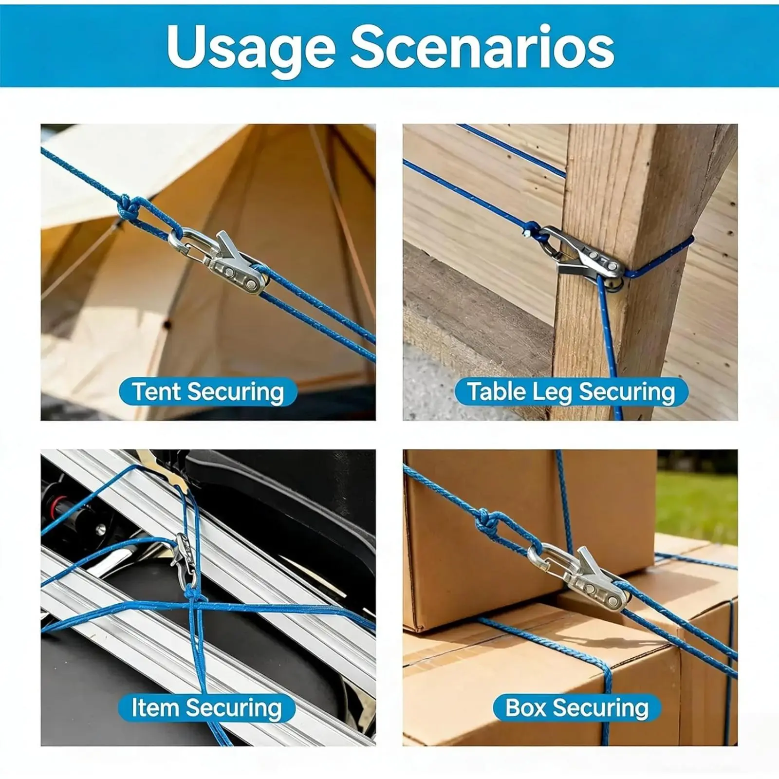 5. Rope with Roller Tensioner for Easy and Safe Bundling, 6-piece Rope Adjuster, Camping and Boating Tie-down Tool with Locking Buckle