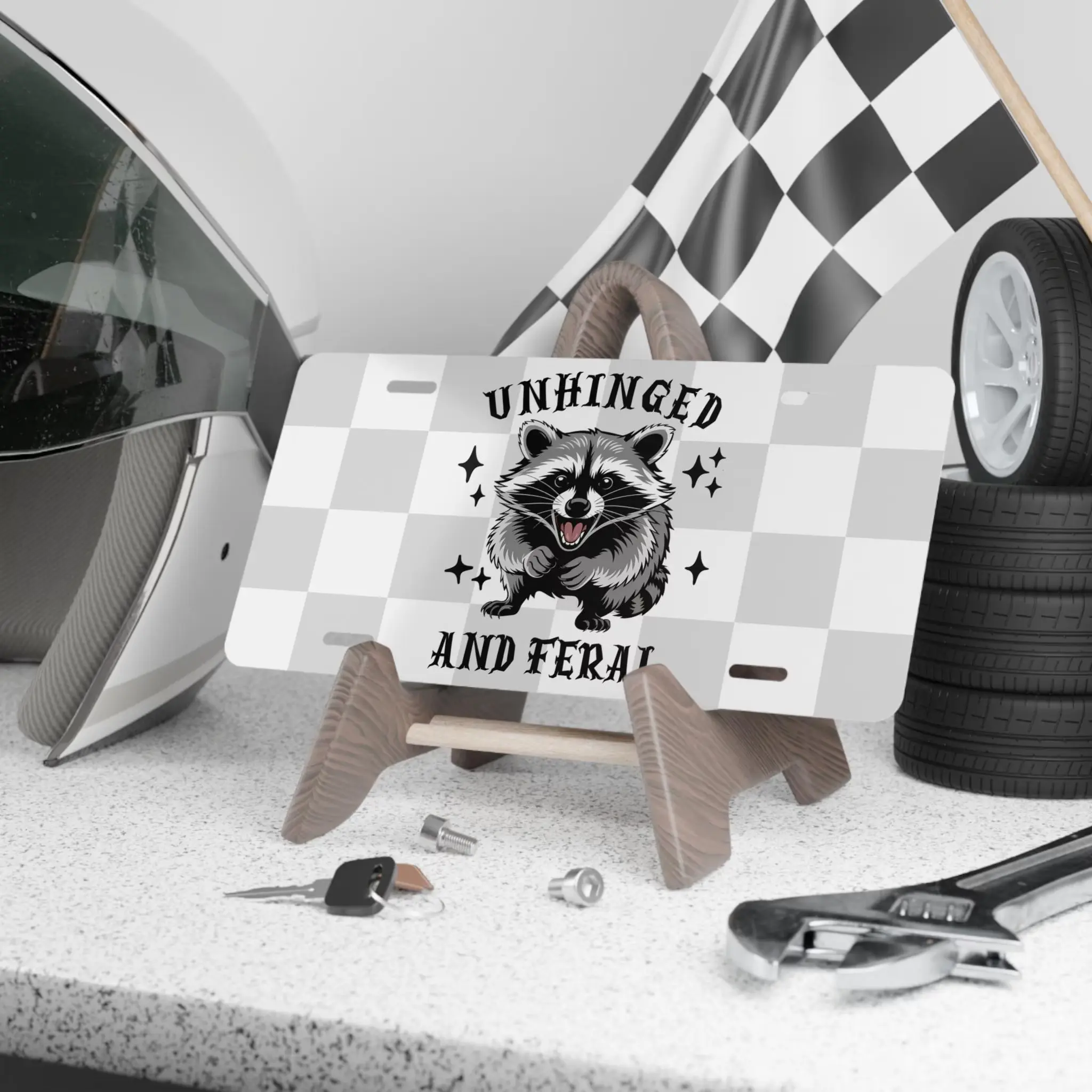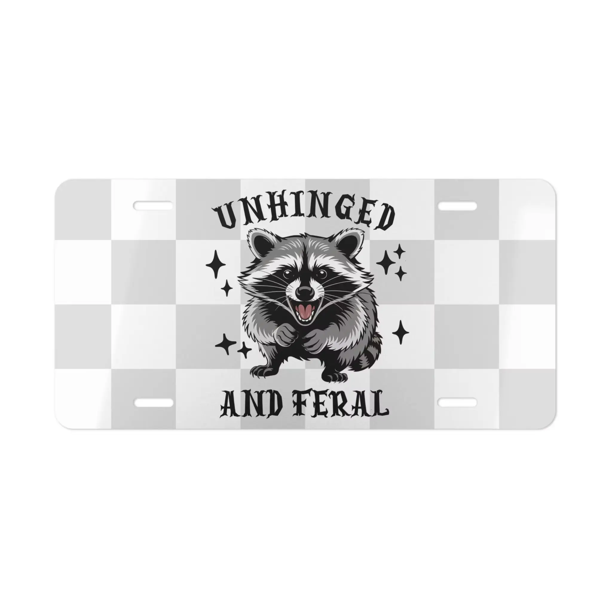 Unhinged and Feral Raccoon Aluminum License Plate | Funny Trash Panda Aesthetic Front Vanity Tag