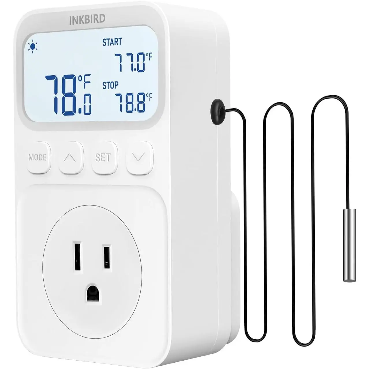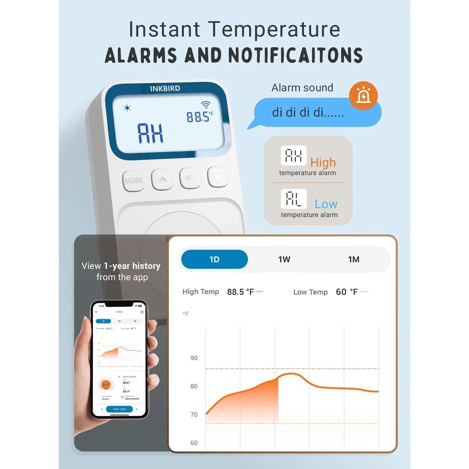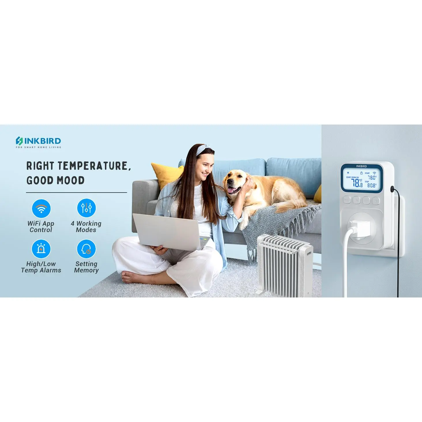 WiFi Remote Control: With INKBIRD app remote control, you can remotely monitor and adjust the temperature settings of your home anytime, anywherePowerful Thermostat: This temperature controller able to control temperautre with countdowm timer and manual mode.With up to 10 operating modes to choose from, it is flexible enough to cope with a variety of temperature control needsUltra Power Output: Maximum output up to 1800W 15A 120V.Temperatures ranging from -40℉ to 212℉.It includes a high-quality temperature probe with IP67 waterproof, can respond quickly and bring you an efficient using experienceSafe & Reliable: It supports high and low temperature alarms, cooling delay and temperature calibration.Power off Memory saves all settings when power off, and automatically continues the execution of the running program, upon power restorationSafe and reliable: Supports high and low temperature alarms, cooling delay and temperature calibration.Power-off memory saves all settings when the power is off and automatically continues running when power is back onWide variety of uses: Idea for greenhouses, reptiles, incubators, freezers, heaters, refrigerators, home brewing, fermentation and heat mats