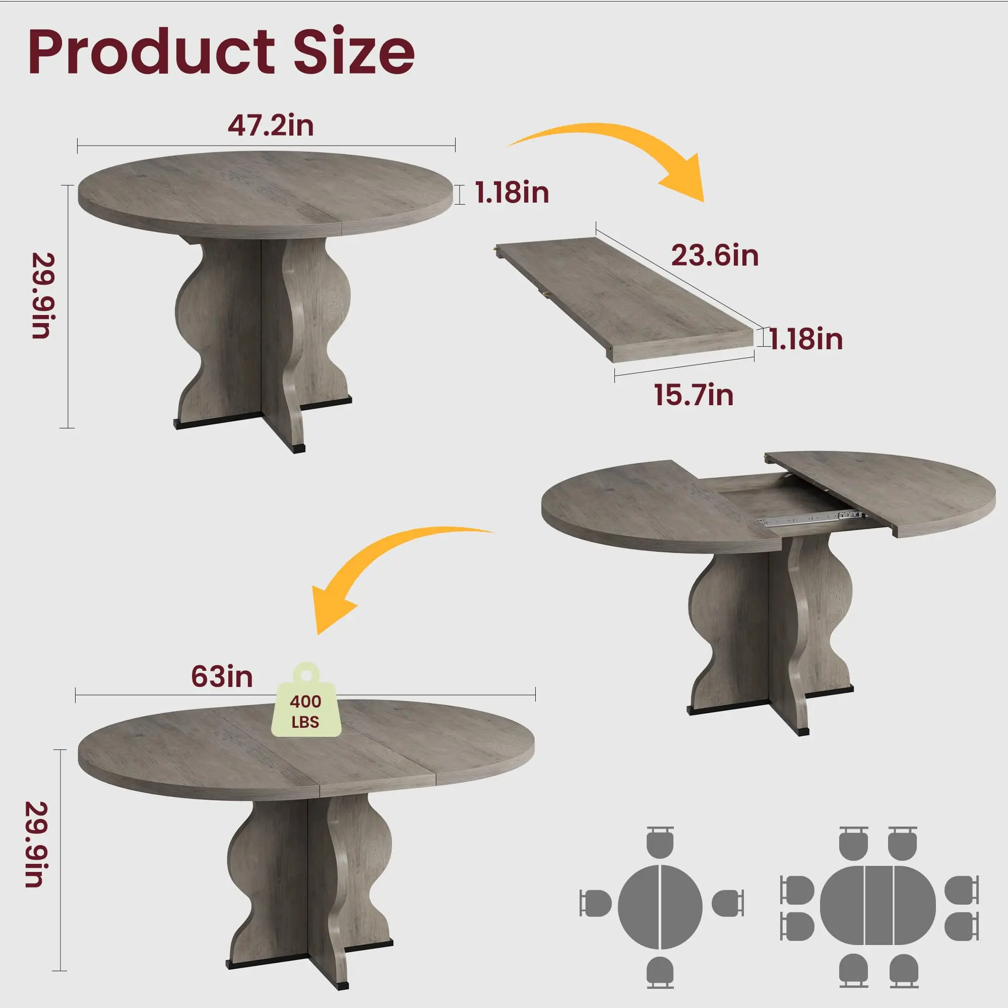 ·Versatile & Space-Saving Design: This elegant round dining table features an innovative extendable function, easily expanding from 47" to 63" to accommodate 4 to 8 people, making it ideal for apartments, kitchens, or any dining space where flexibility is key.