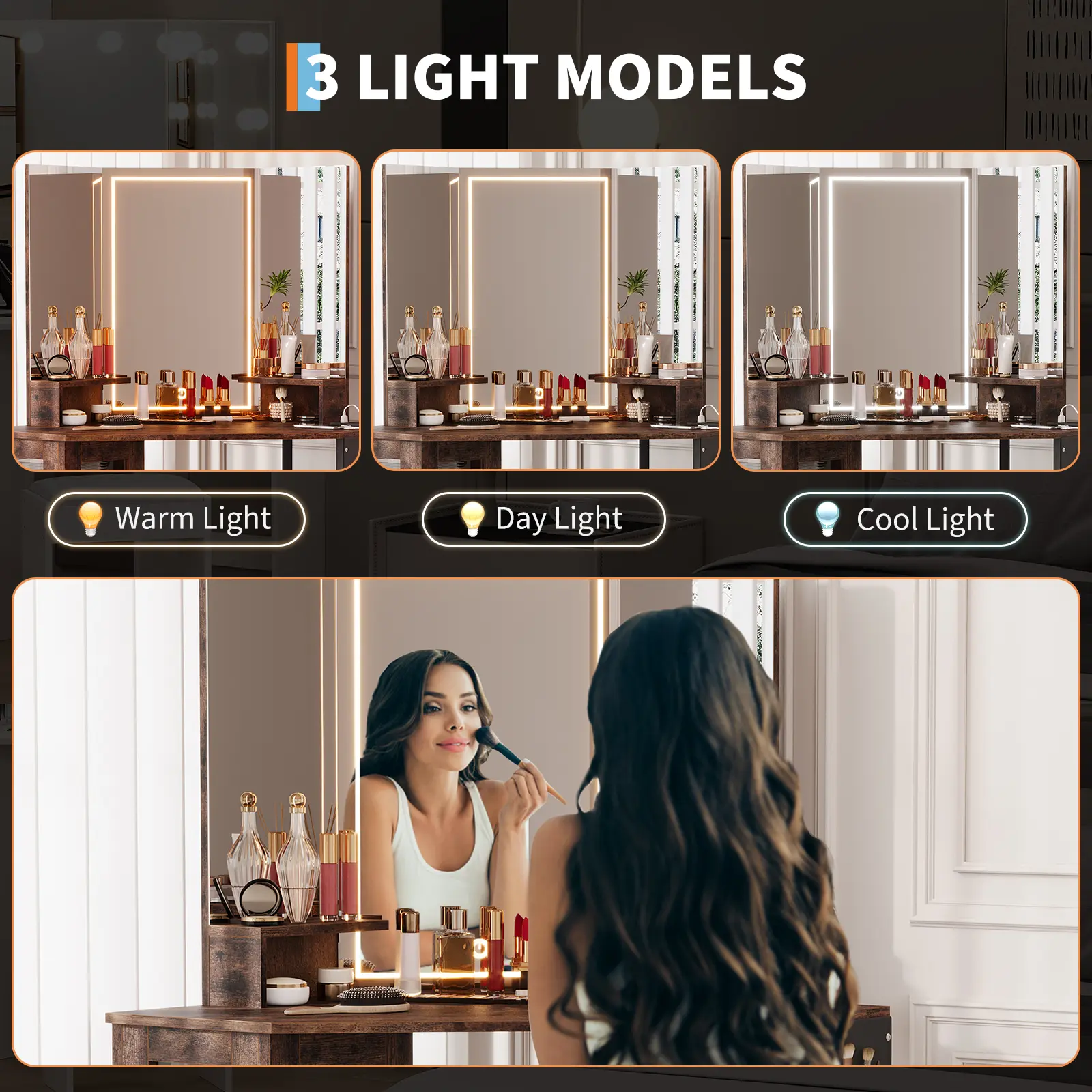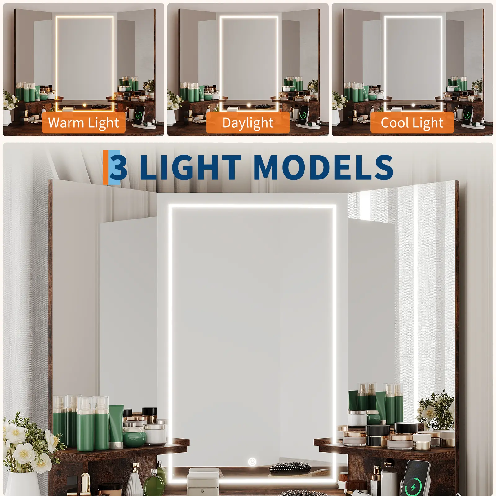 ·Customizable LED Mirror: Features a 3-fold mirror with 3 adjustable lighting modes (warm, day, cool) for flawless makeup, skincare, and hair styling at any time.