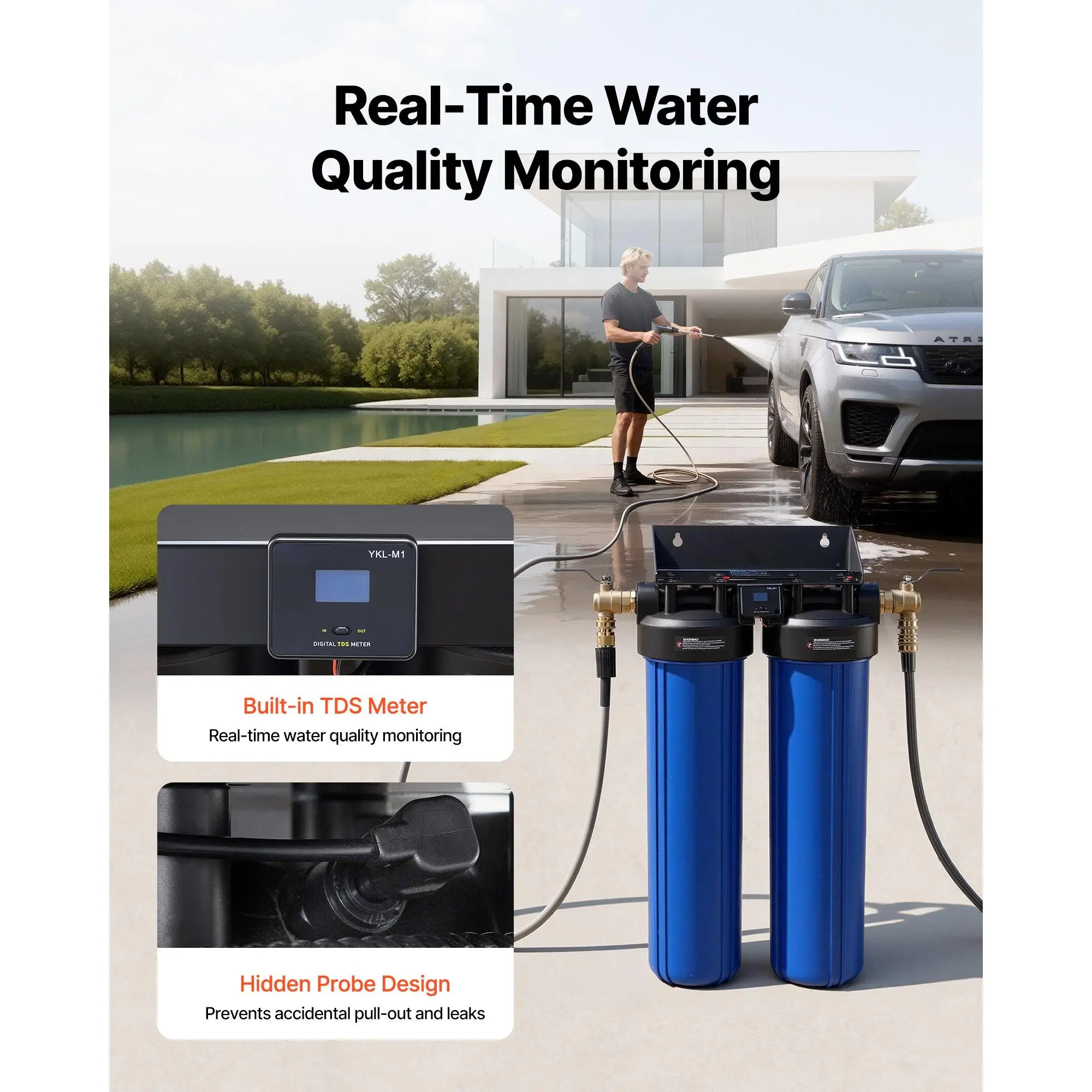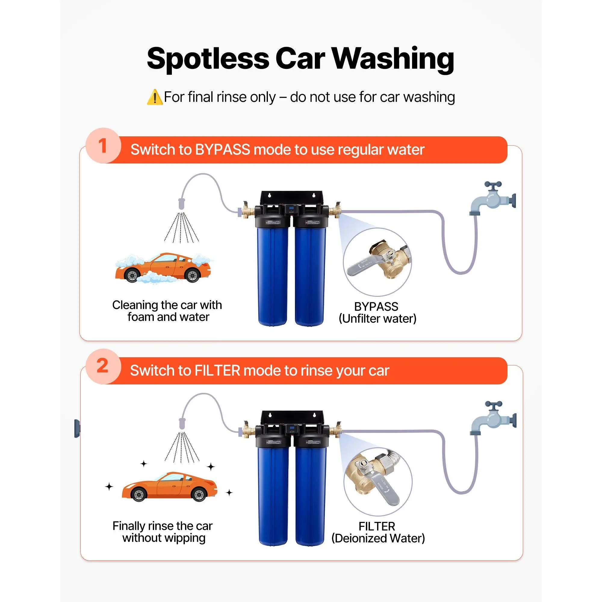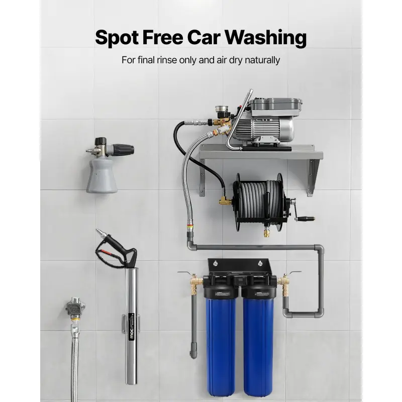 Spotless Car Wash: Featuring 2 x 4L premium mixed-bed resin, this deionized water system for the final stage of car wash efficiently removes calcium, magnesium, and other dissolved ions, allowing the car to air dry naturally for a spot-free finish without wiping, saving time and effortStrong Purification Capacity: Under average 200 ppm water conditions, this spotless car wash water system delivers a rated purified water capacity of up to 330 Gallons (1250 L), providing sufficient deionized water for continuous spotless car washesReal-time Water Quality Monitoring: Designed with a TDS meter, this water deionizer for car washing allows quick checks and timely resin refills to maintain optimal water purity and get spotless results.Replacement is recommended around 30 ppmDual-Mode Operation: Switch to BYPASS mode to wash the car with tap water, apply soap foam, and rinse off the foam.Then switch to FILTER mode for the final deionized water rinse and let it air dry naturally for a spotless finishUser-Friendly Design: This spotless water system features a wall-mount bracket for secure installation on a panel or water supply tank.Also comes with US and EU standard connectors to meet different connection needsVEVOR Deionized Water System for Car Wash, Spotless Car Wash Water System with 2 x 4L DI Resin, Bypass Valve & TDS Meter, Spot-Free Deionized Water Filter for Cars RVs Motorcycles Windows