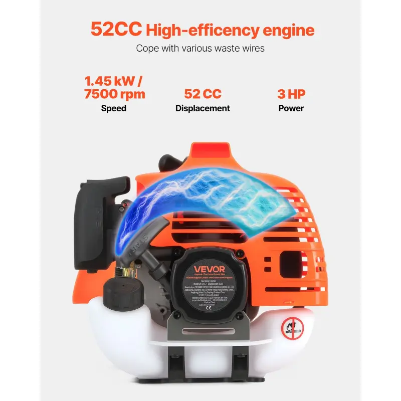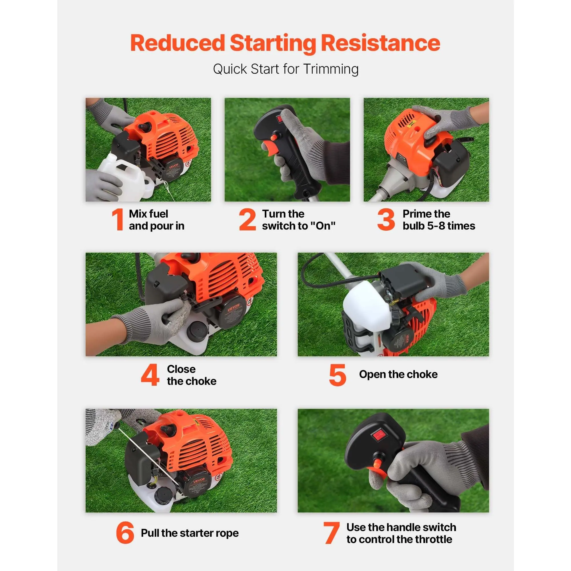 High-Performance Power: Powered by a 52 cc two-stroke engine, this cordless string trimmer delivers 1 HP and reaches speeds of up to 7500 rpm.It handles a wide range of grass types quickly and efficiently, improving work efficiencyVersatile 2-in-1 Design: This weed wacker features a nylon trimmer head and a 3T blade.The ø10 in/ø255 mm steel blade cuts thick weeds and small shrubs, while the ø3.9 in/ø100 mm nylon trimmer head handles various lawn mowing tasksEasy Starting, Reliable Use: Equipped with a throttle guard, this string trimmer reduces the risk of accidental starting.The 1150 ml fuel tank minimizes refueling frequency, while the 40:1 fuel mix ratio reduces starting resistanceFast Trimming: The bottom button allows quick line release, enabling the weed eater to be ready for use in seconds.The straight-shaft design provides easy access into bushes and supports smooth switching between the blade and trimmer headUser-Friendly Design: This grass trimmer supports handheld or shoulder-strap use with adjustable height.The ergonomic, non-slip U-shaped handle ensures a secure grip, while the quick-release split shaft allows for convenient storageVEVOR Cordless String Trimmer, 52 cc 2-Stroke, Gas Powered Weed Wacker, 17" Cordless Grass Trimmer, Multi-Functional Lawn Edger with Shoulder Strap & 3T Blade, Weed Eater for Quick Grass Cleaning