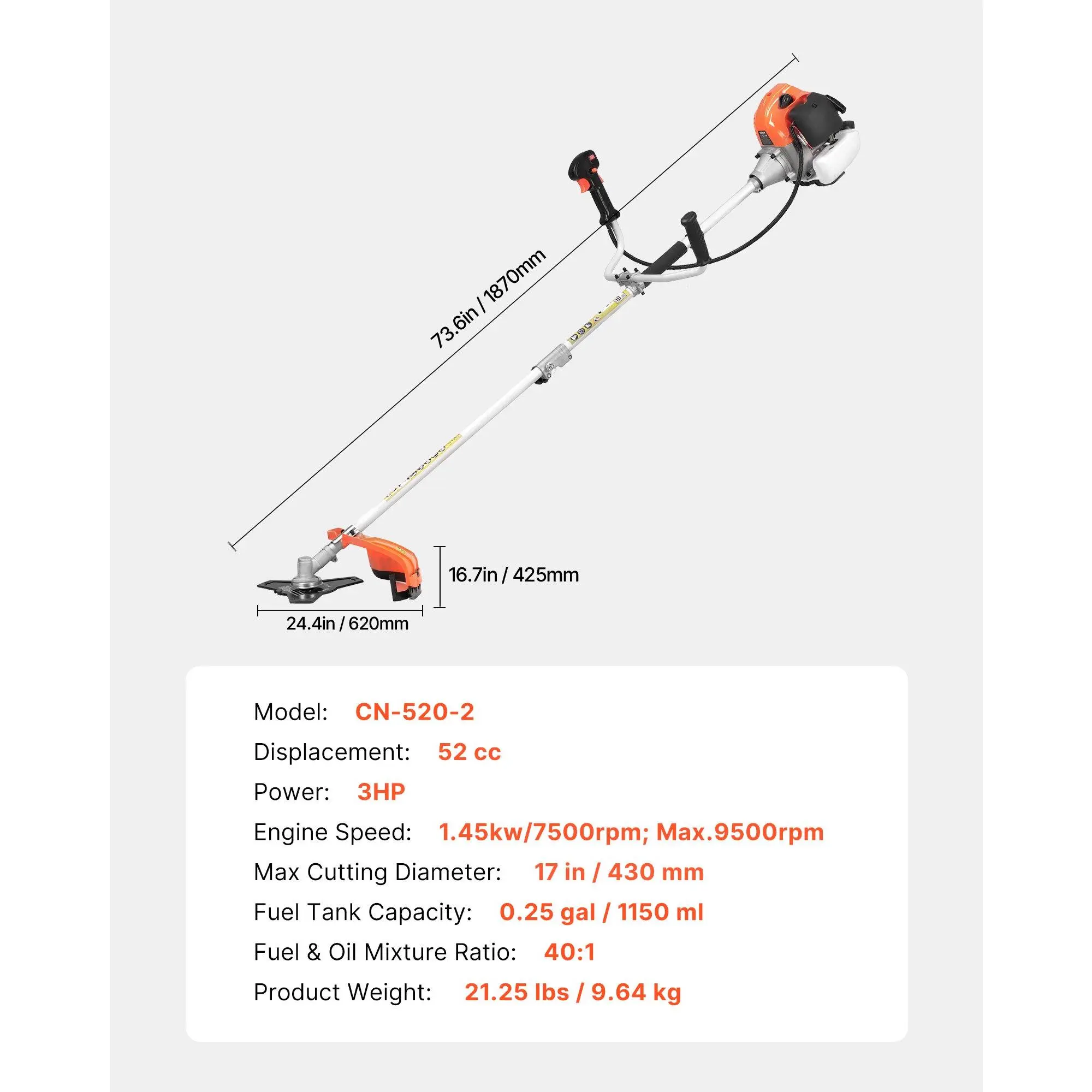 Max Cutting Diameter: 16. 93 in / 430 mm,Engine Speed: 1. 45 kW / 7500 rpm,Item Model Number: CN-520-2,Fuel & Oil Mixing Ratio: 40 : 1,Product Weight: 21. 25 lbs / 9. 64 kg,Fuel Tank Capacity: 0. 25 gal / 1150 ml,Product Dimensions: 73. 6 x 24. 4 x 16. 7 in / 1870 x 620 x 425 mm,Displacement: 52 cc,Power: 3 HP,Max Speed: 9500 rpm