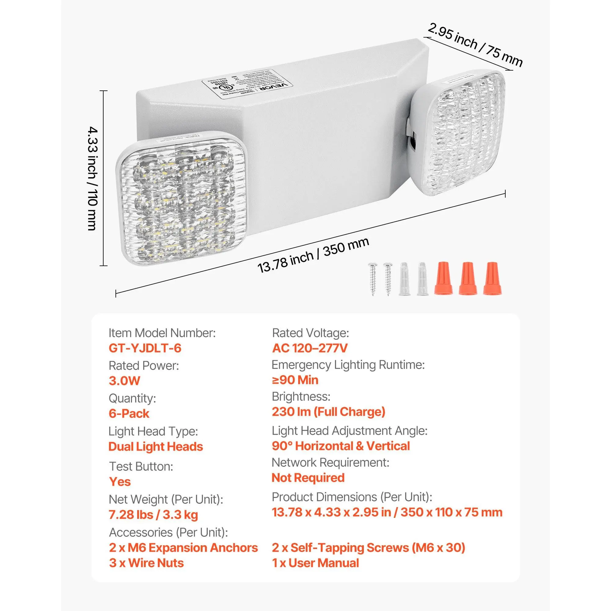 Emergency Lighting Runtime: ≥90 Min,Network Requirement: Not Required,Brightness: 230 lm (Full Charge),Item Model Number: GT-YJDLT-6,Test Button: Yes,Quantity: 6-Pack,Rated Power: 3W,Light Head Adjustment Angle: 90 ° Horizontal & Vertical ,Rated Voltage: AC 120–277V,Light Head Type: Dual Light Heads
