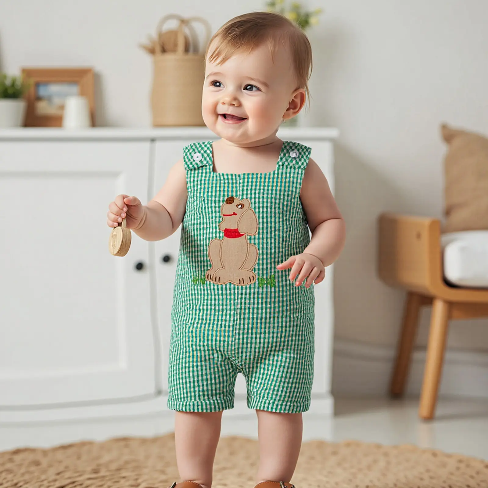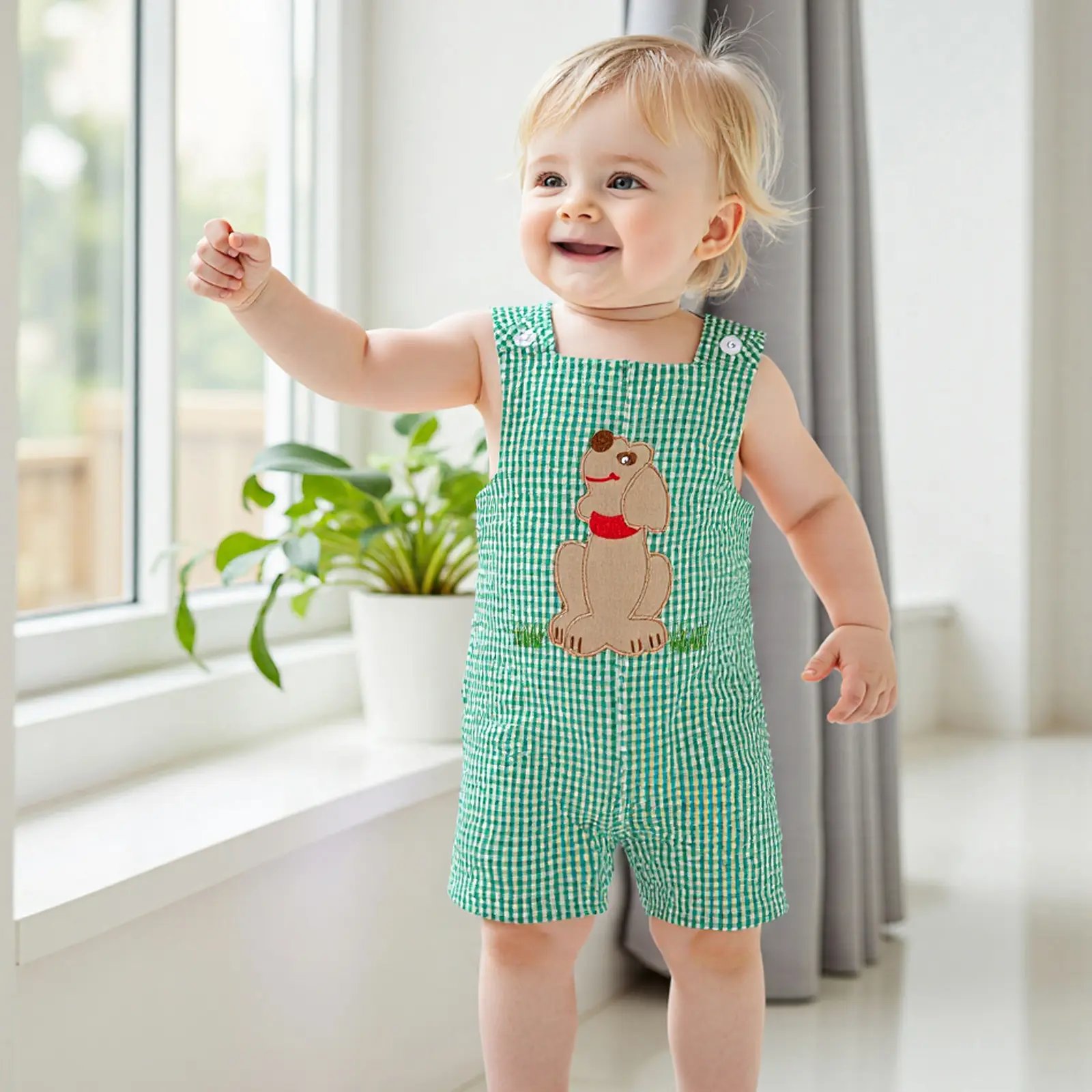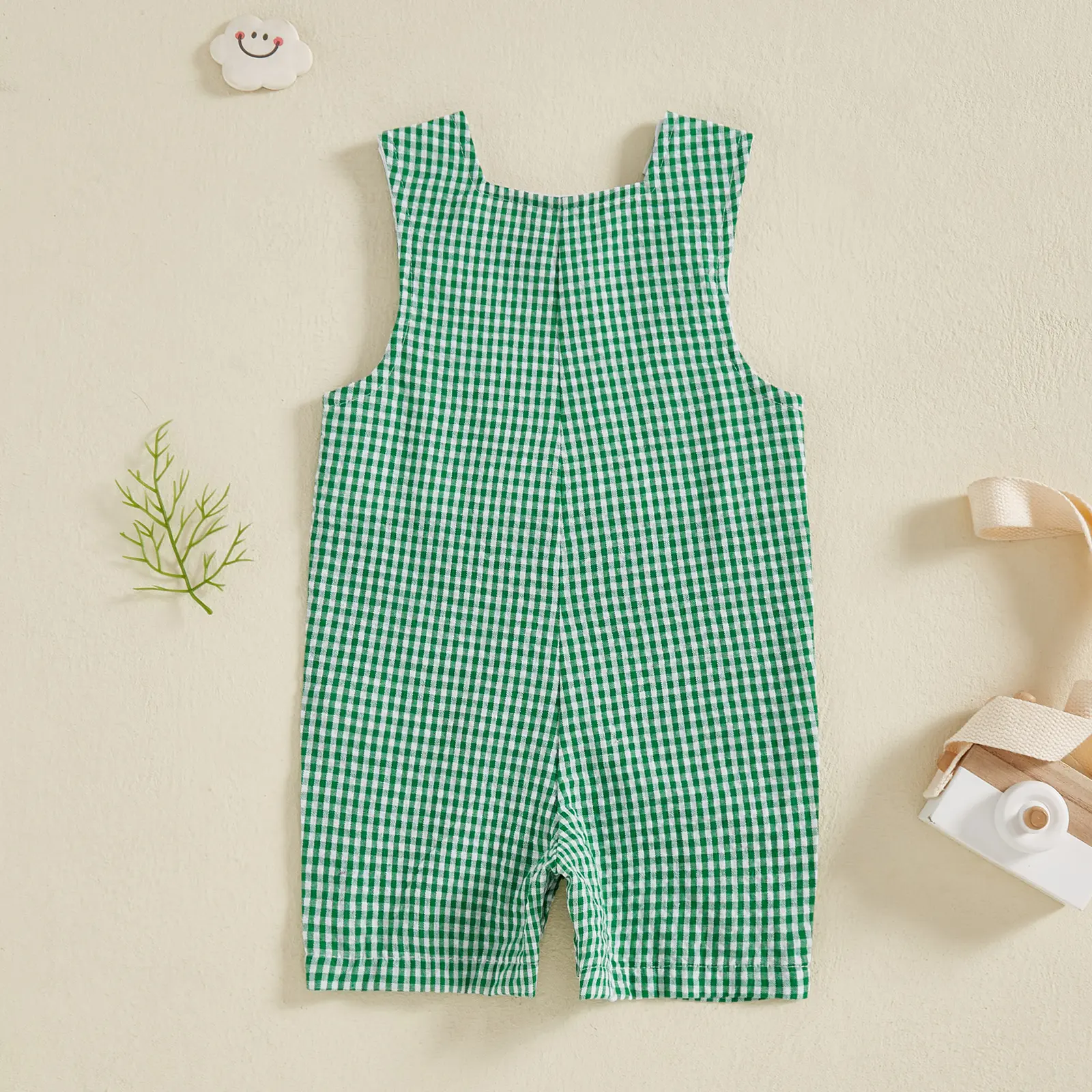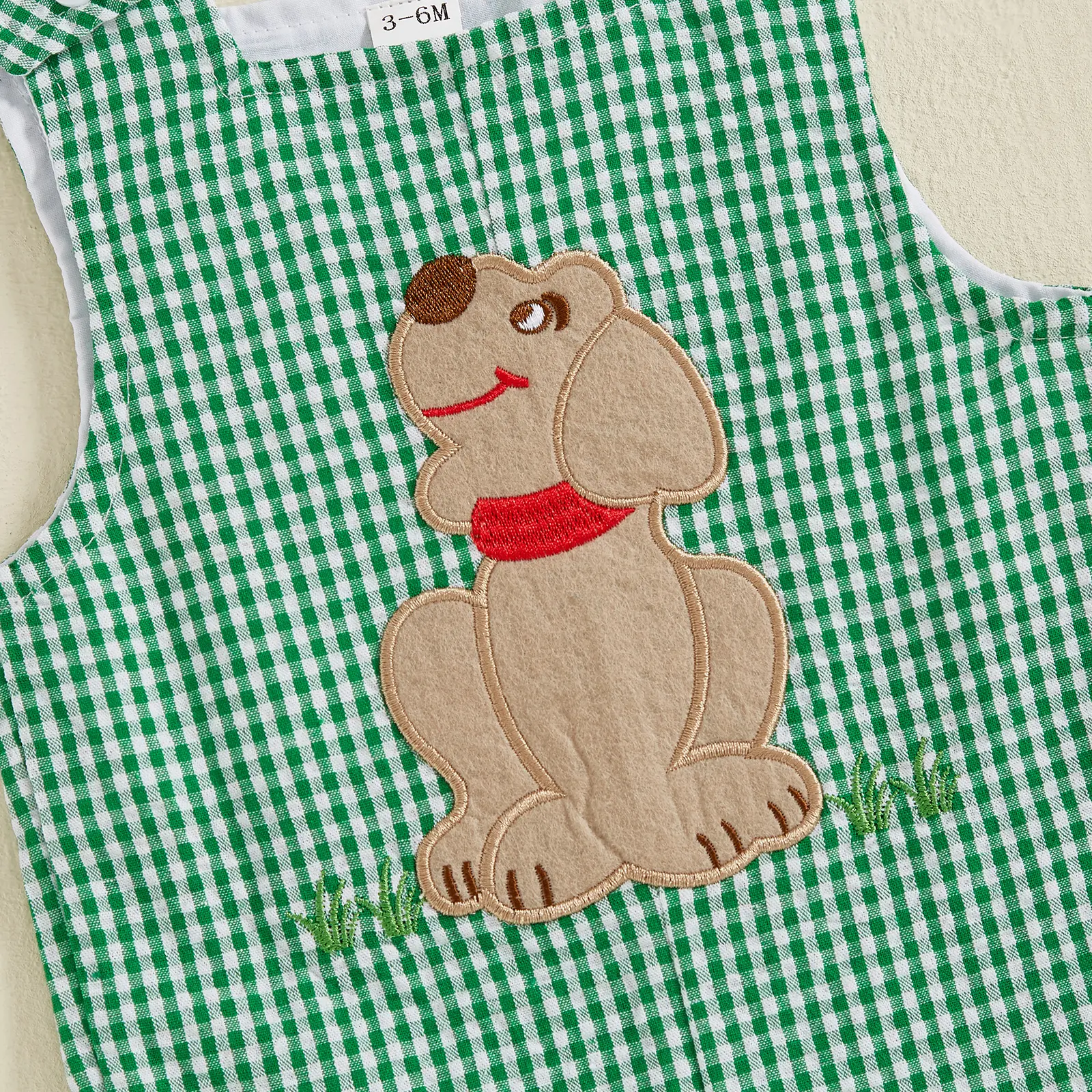 Toddler Baby Plaid Overalls Romper Truck/Dog Embroidered Square Neck Sleeveless Bodysuit Cute Summer Clothes