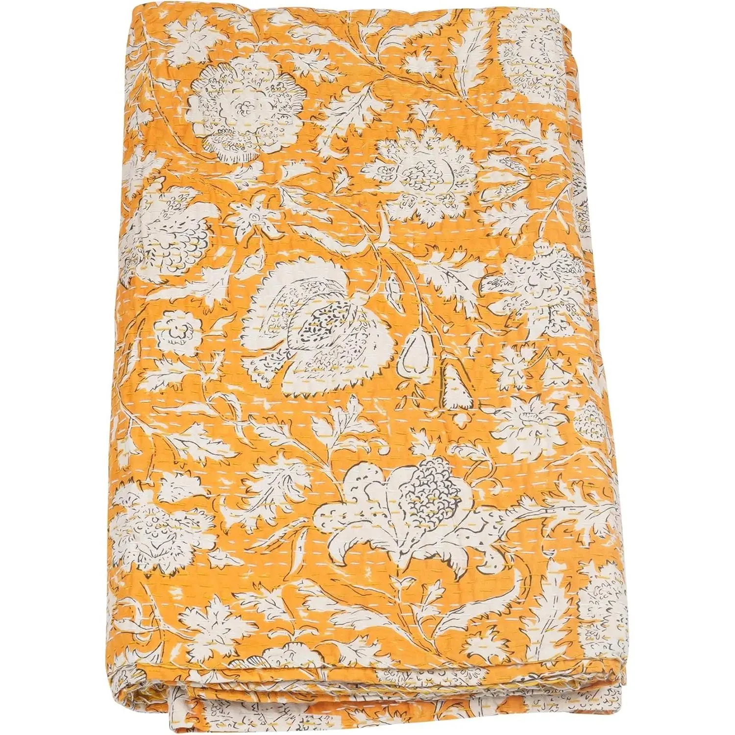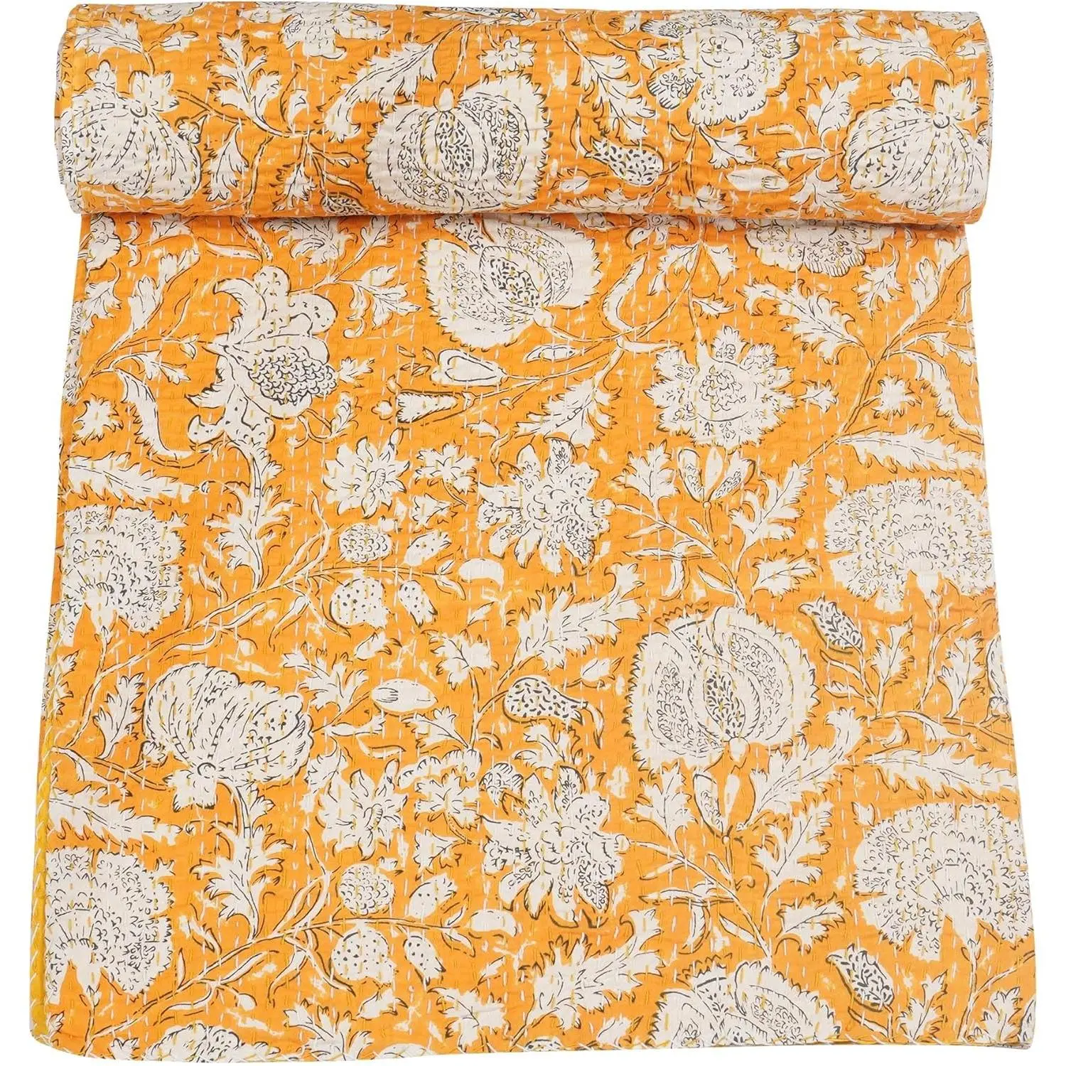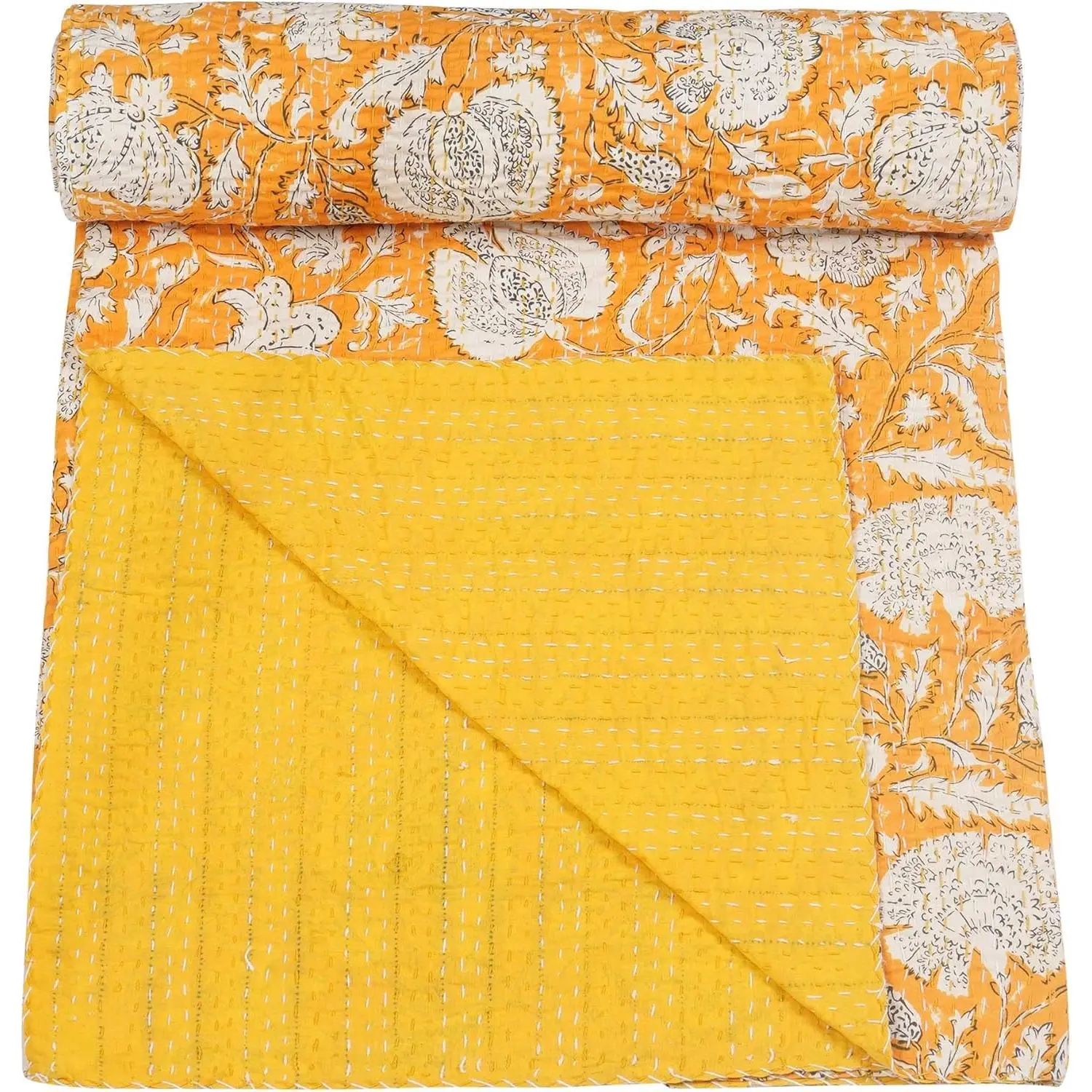 Indian Hippie Floral Print Kantha Indian Cotton Bedding Throw Blanket Bespread Hand Stitched (Yellow, Queen (90"x 108"))
