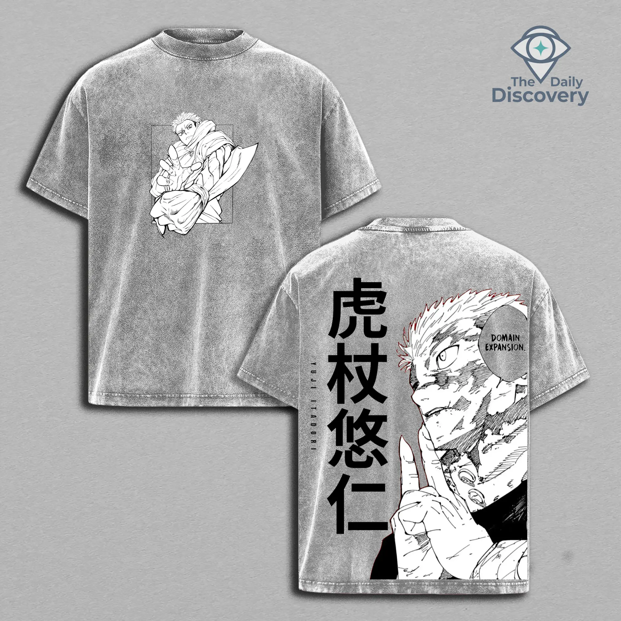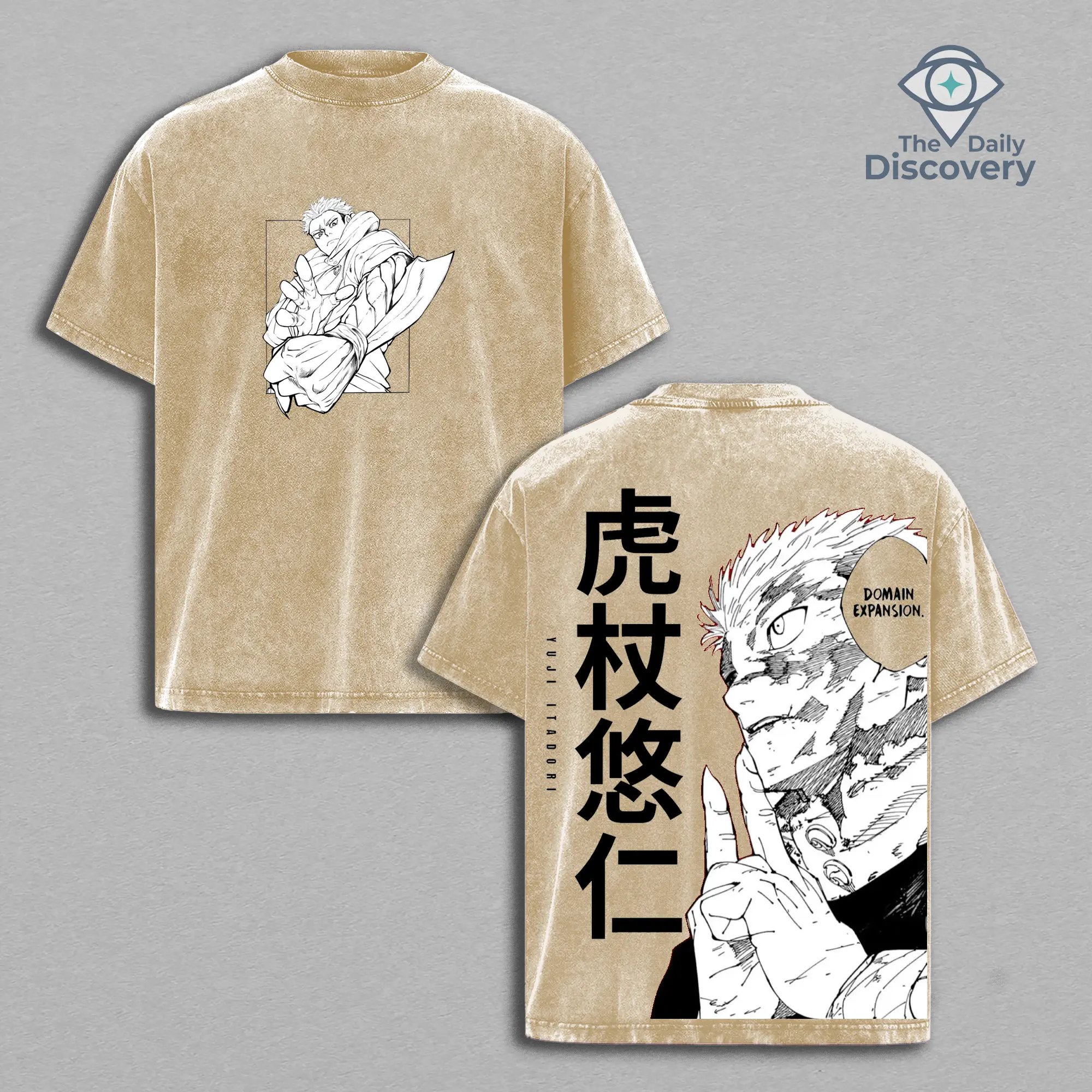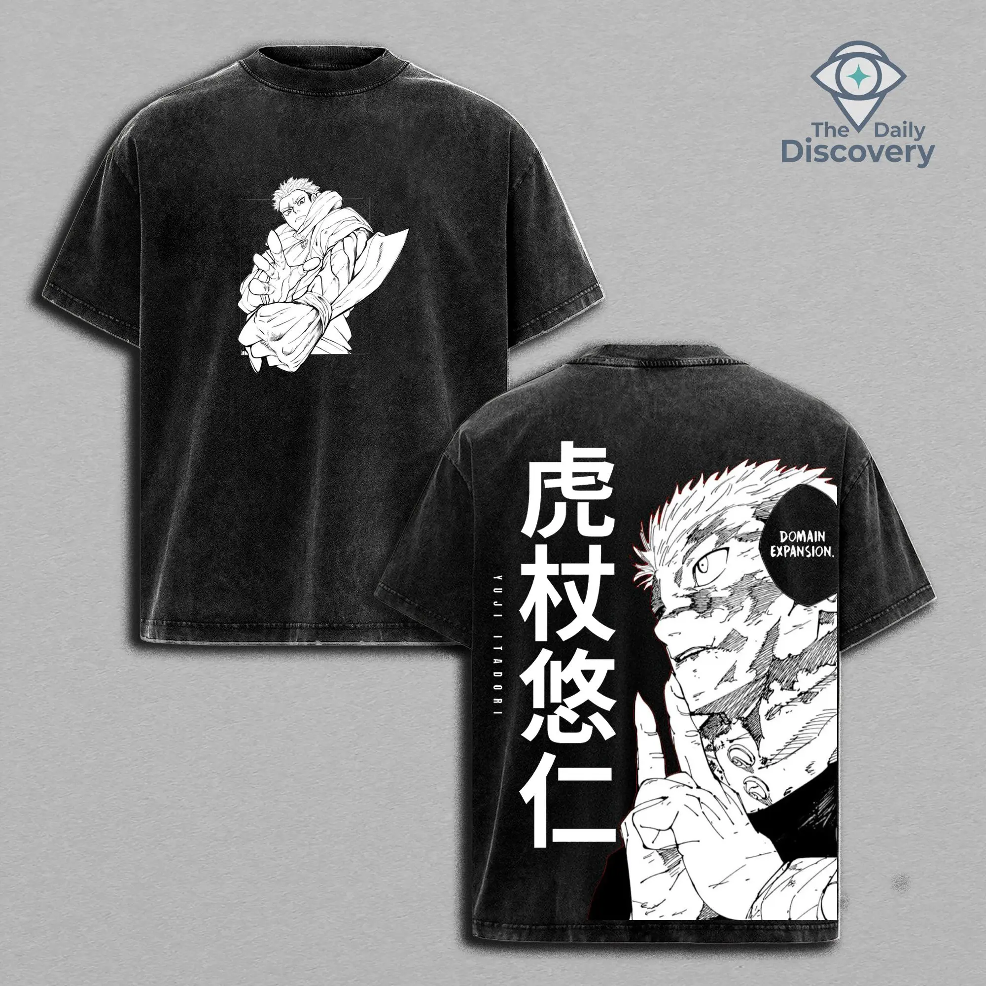Yuji Itadori Tee Washed Vessel Edition Jujutsu Kaisen: Execution Shibuya Incident Compilation & Culling Game Prelude Vintage Oversized Heavy Cotton Anime Manga T-Shirt, Double Printed Retro Unisex Streetwear Top for JJK Fans S5H VGW