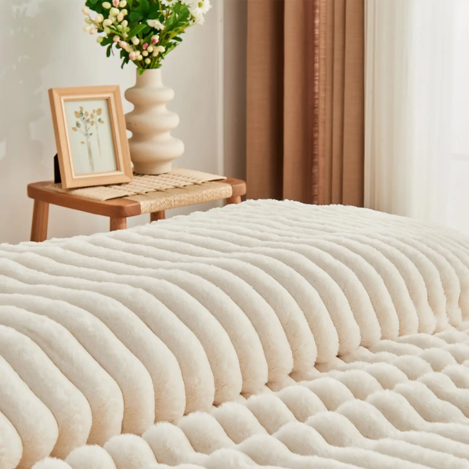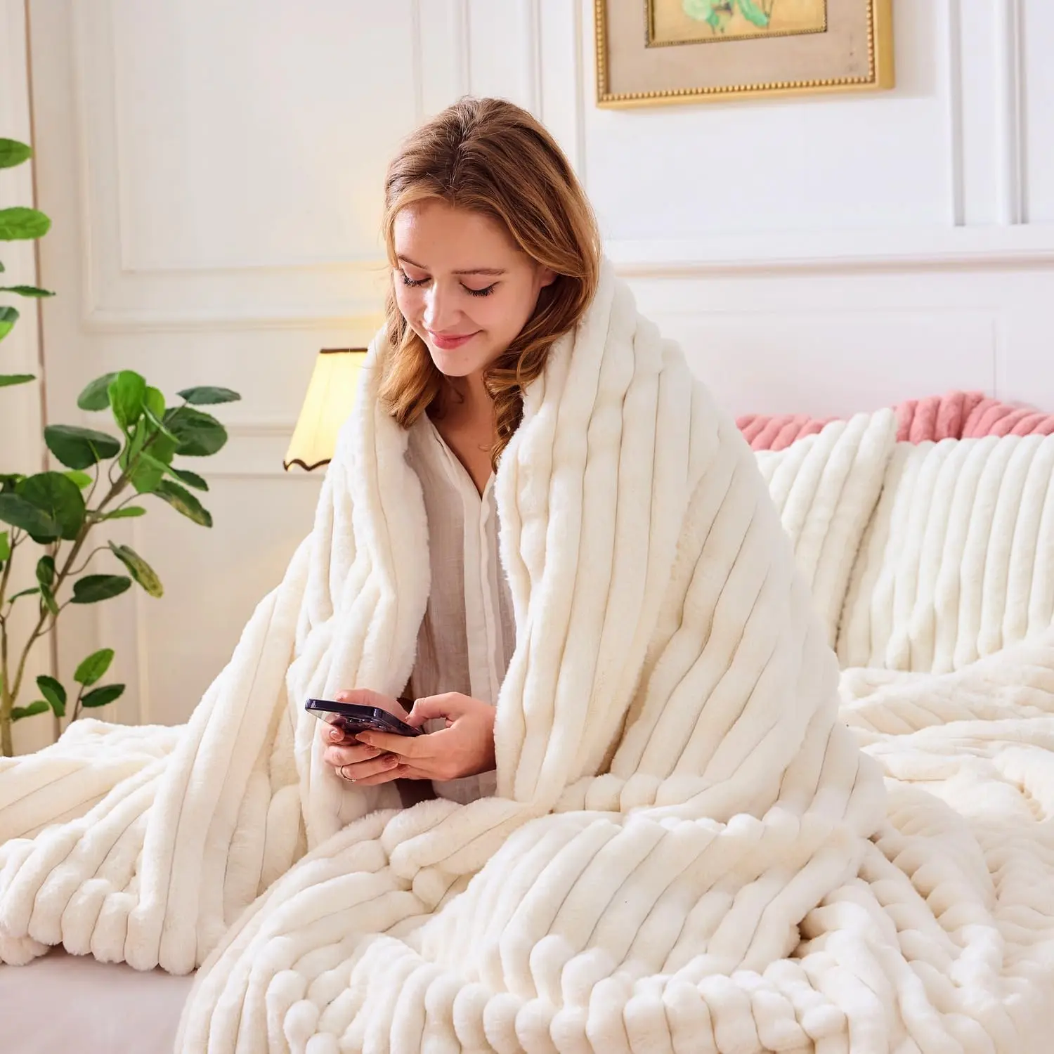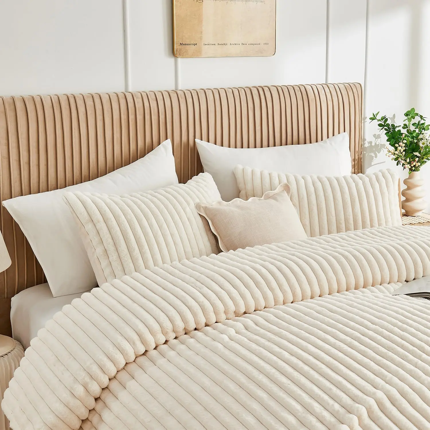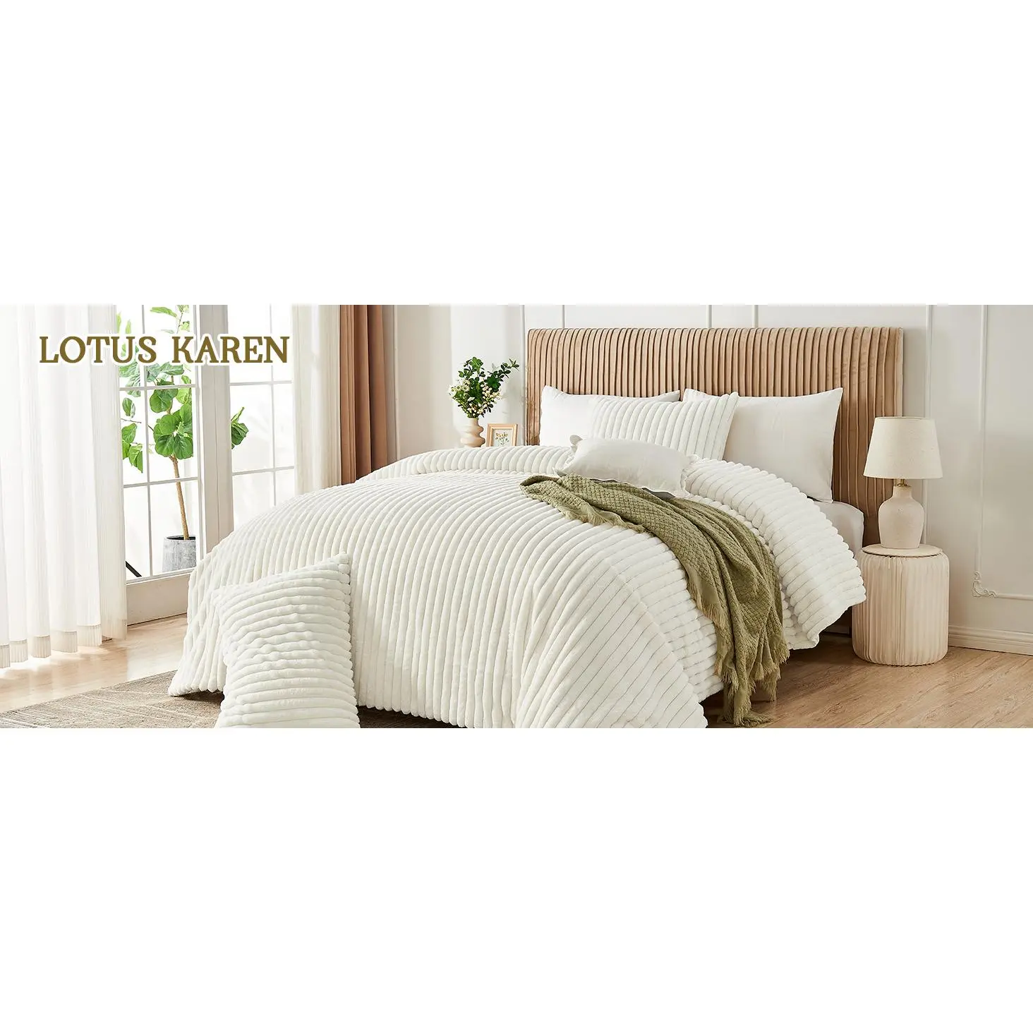 Faux Rabbit Fur Comforter: The sleeping side is crafted from solid-color flannel, providing a smooth, warm surface that is gentle against the skin, cozy for you and your family in the winter.The other side is made from 3D striped faux rabbit fur, delivering an exceptionally plush and soft texture that adds a luxurious feel to your bedding.What You Get: Our 3-piece full bedding set for women and men include a full comforter 80" x 90" and two pillowcases 20" x 26".Queen bedding sets: a bed comforter queen 90" x 90" and two pillowcases 20" x 26".King bedding set: a fluffy king comforter 90" x 104" and two pillowcases 20" x 36".Luxurious 3D Vertical Stripe Design: This plush comforter set features a distinctive striped aesthetic that elevates bedroom decor with clean, sophisticated style while enveloping you in cozy warmth.Perfectly blending contemporary flair with refined texture, it serves as the ideal choice for any bedroom ensemble.Premium Filling: Filled with premium down alternative fiber, this warm comforter for winter offers optimal loft and warmth with a soft, fluffy texture that provides superior insulation for colder nights.The high-quality fill is highly resilient, maintaining its shape and offering excellent elasticity and compression resistance, ensuring lasting fluffiness and comfort.Easy to Maintain: Lotus Karen soft fluffy comforter set is easy to maintain and machine washable. Simply machine wash in cold water on a gentle cycle for a like-new restoration. Our comforter is delivered in a vacuum-sealed package. Gently pat the comforter and allow it to rest for up to 50 hours to restore its maximum fluffiness. Or you can tumble dry it in low temperature.