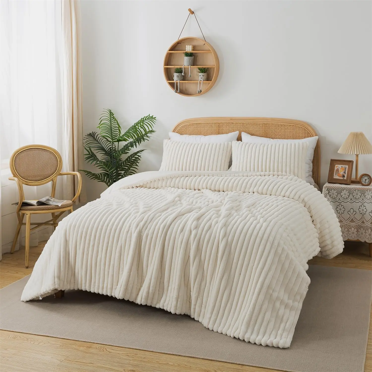 Faux Fur King Size Comforter Set 3 Pieces – Soft White Comforter Full Size, Vertical Striped Faux Fur Fuzzy Warm Bedding Set(1 Comforter and 2 Pillowcases)