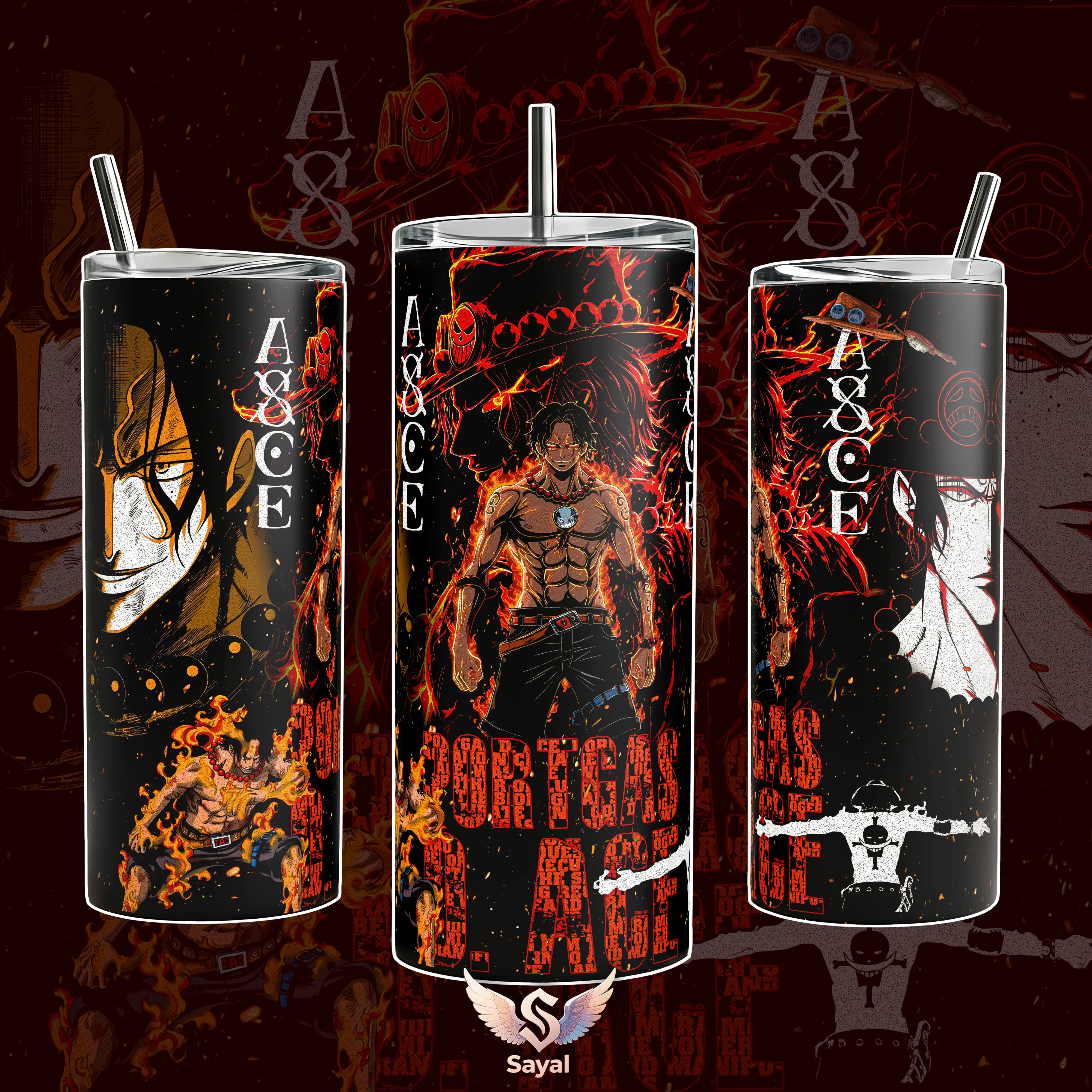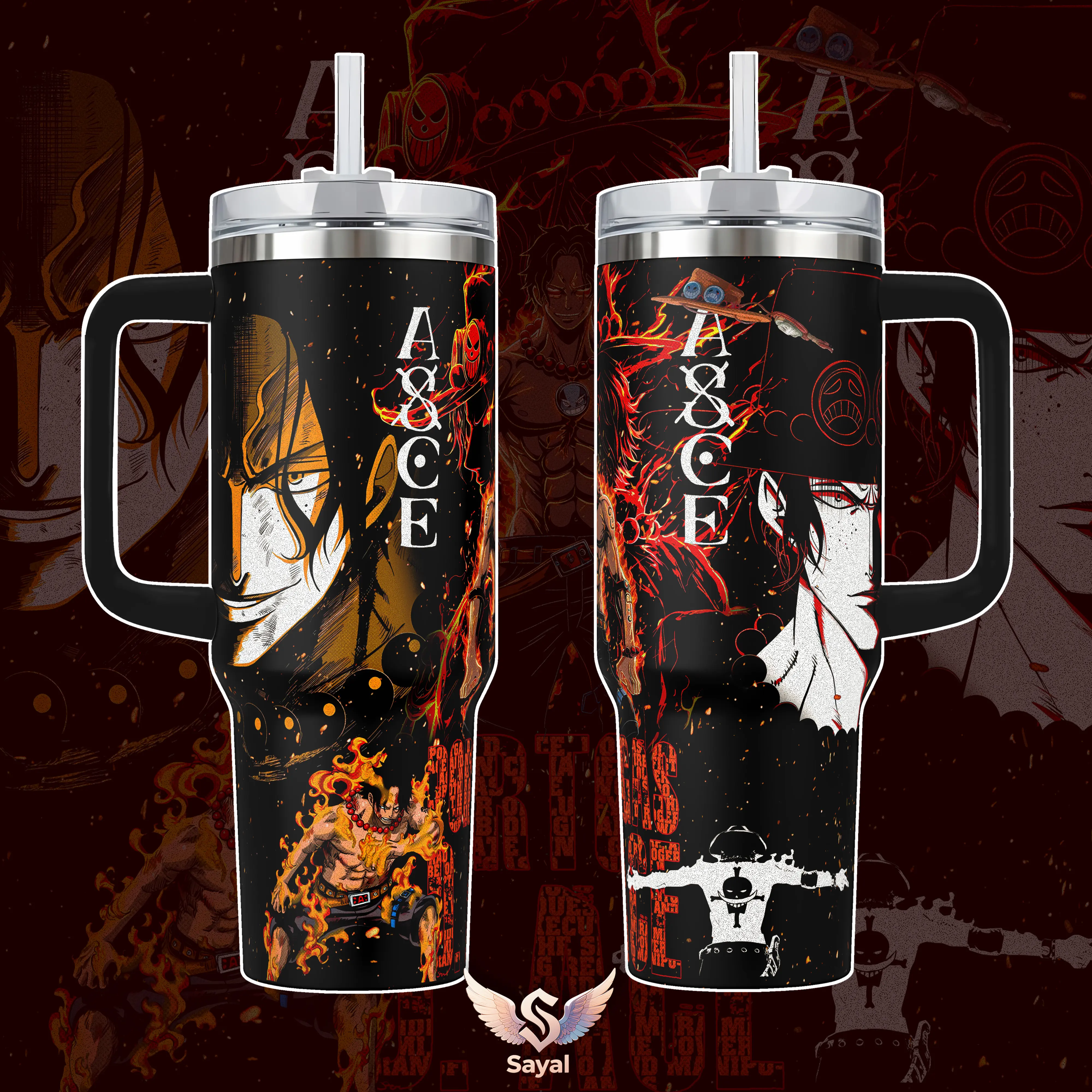 Postgas D.Ace Fire Fist One P 40 oz Tumbler Mera Mera no Mi Devil Power Flame Graphic Design Vacuum Insulated Travel Mug with Handle 18/8 Steel Keeps Drinks Cold 12H+ Hot 6H Anime Manga Merch Cosplayers Straw Hat Fans Gift for Lovers