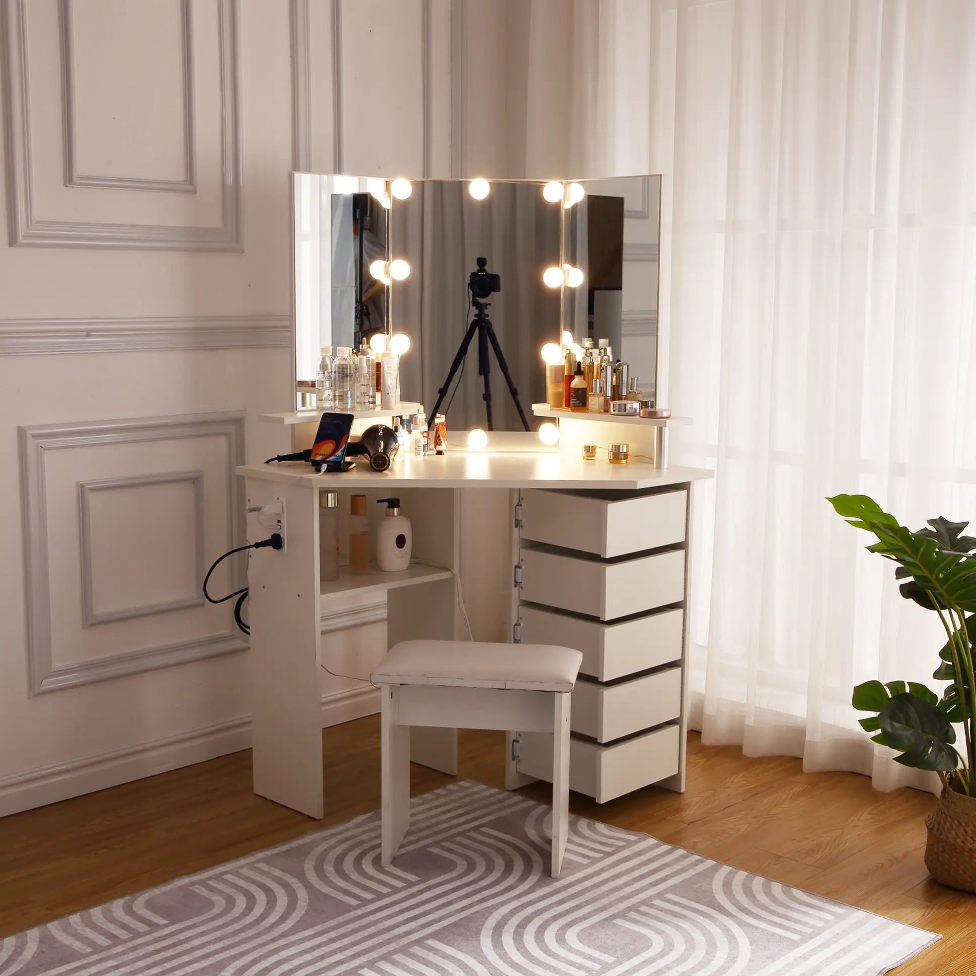 Corner Vanity Desk, Makeup Vanity with Mirror and Lights, White Vanity, 5 Drawers, Adjustable Brightness, Vanity with Stool, Bedroom Dressing Table