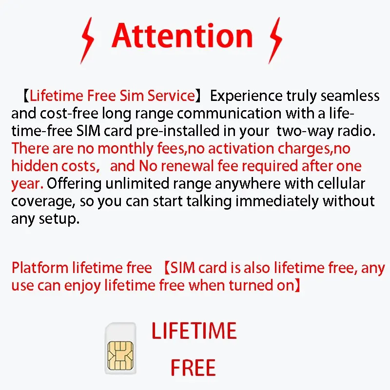 The walkie talkie equipped with a SIM card supports long-distance calls over 5000 kilometers and enjoys permanent free use of the SIM card.