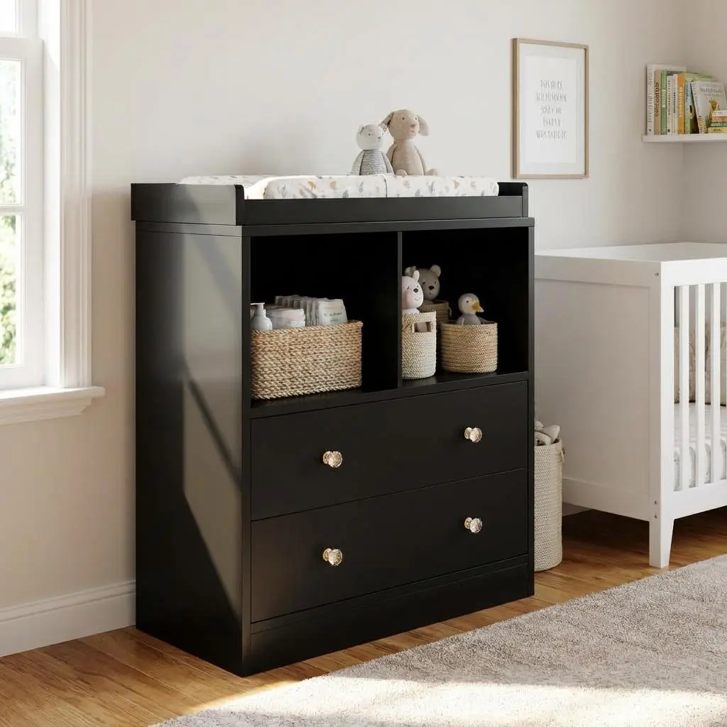 Two-in-One Nursery Organizer: Changing Station & Dresser This versatile unit combines a spacious, safe changing area with a 2-drawer dresser, providing ample room to organize clothes, diapers, and all baby essentials in one compact piece, perfect for maximizing space in any nursery.
