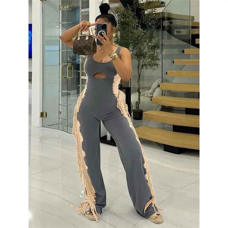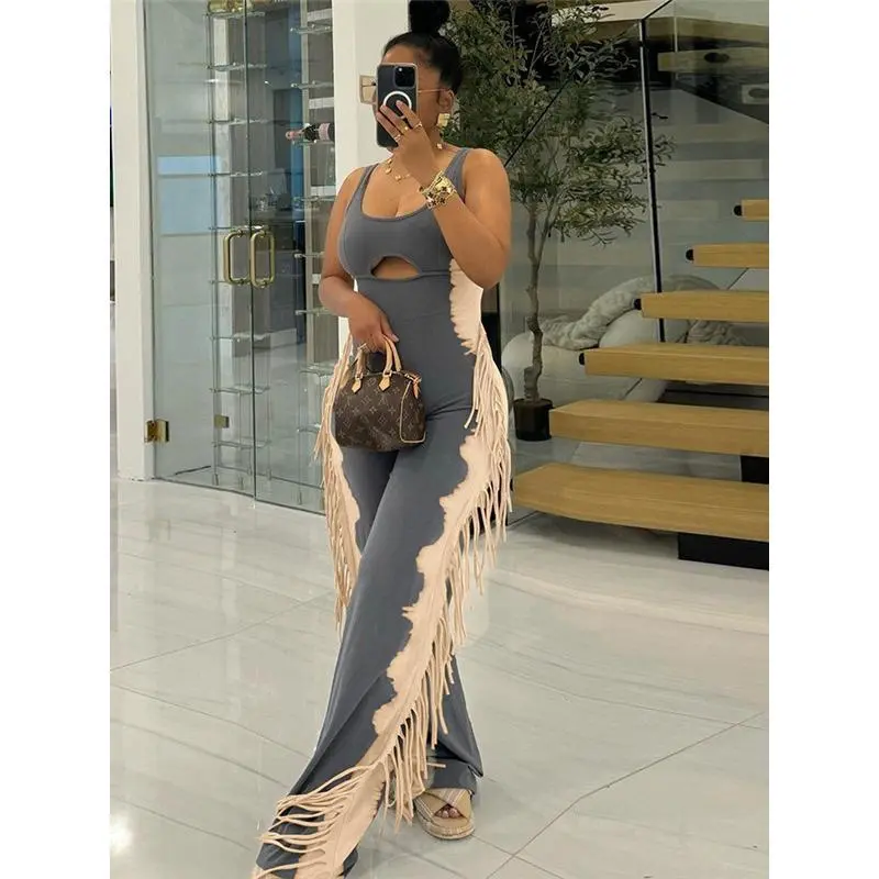 Fabric name: polyester/Styles: Sexy styles/Sleeve length: sleepveless/Year/Season: Spring 2025/Popular elements: tassels/Color: Gray-1/Size: S, M, L, XL, XXL/Article number: D9769/Main fabric composition content: 95% or above/Style type: Private server celebrity/Pants: Tight/Waist shape: mid-waist/Pants length: long pants/Sleeve Type: Sleeveless/Main downstream sales areas 1: Europe and the United States/Style: Jumpsuit/Elasticity: Hit/Cross-border style type: sexy hot girls/Main fabric composition: polyester (polyester fiber)/Whether to cross-border supply: Yes/Thickness: Thick/Craft: Printing