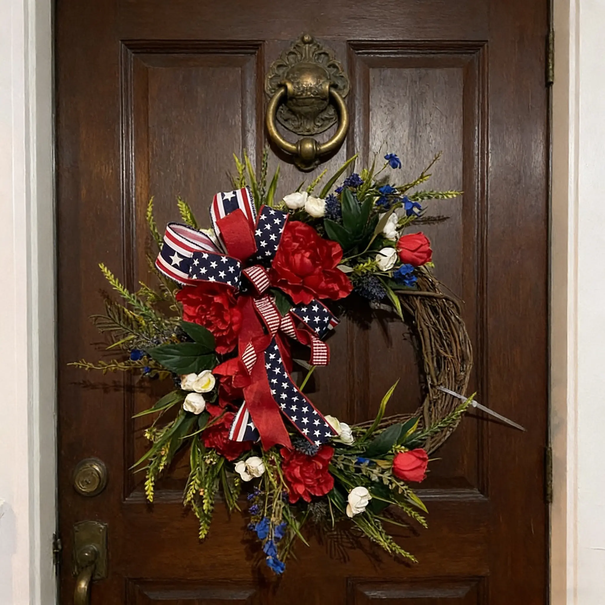 【Patriotic Bow】: Adorned with a patriotic bow, this wreath adds a festive touch to your holiday decorations.