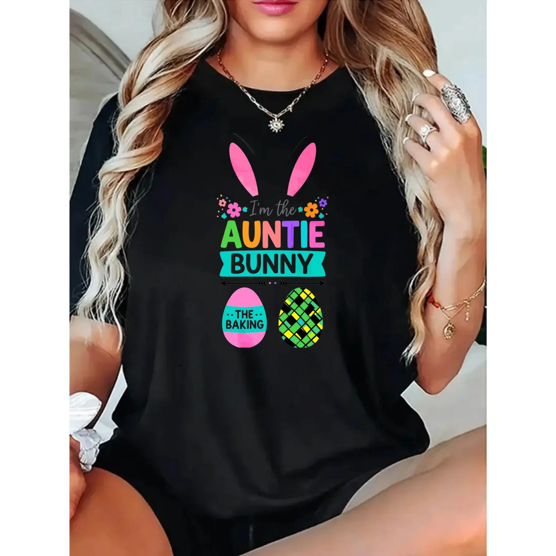Women's Black T Shirt With Easter Bunny Ears And Text Im The Auntie Bunny The Baking Egg Pattern Print