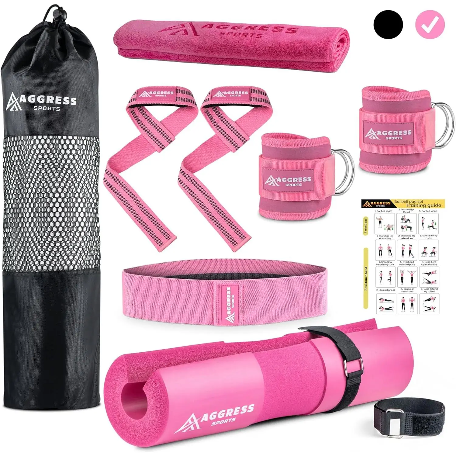 · COMPLETE SET includes pink barbell pad, ankle straps for cable machines, weight lifting straps, Resistance bands for legs and butt, microfiber towel and bag;