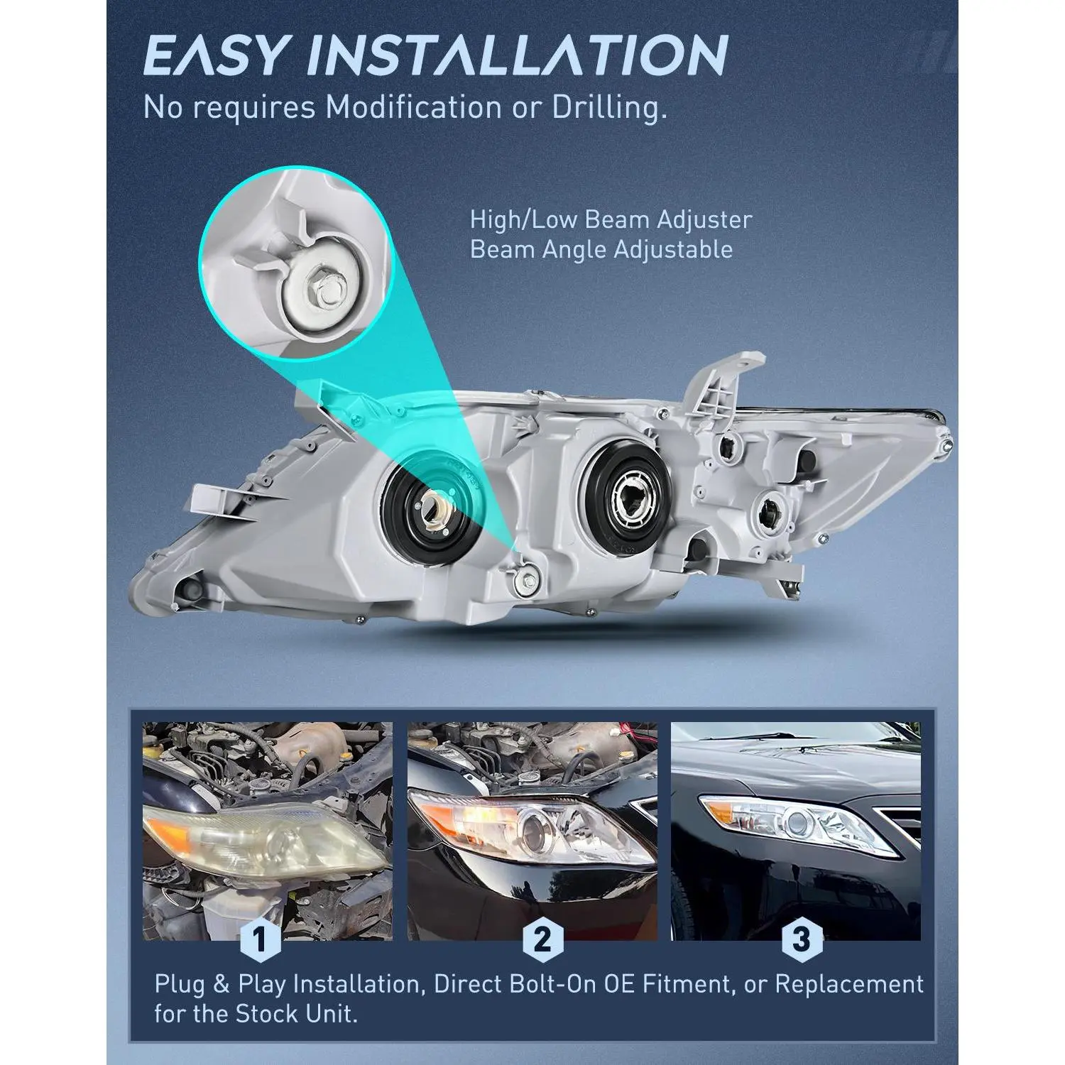 ·DOT Compliance and safe Driving: To ensure driving safety for you and the oncoming driving circumstance, our 2010 2011 Toyota Camry headlights are DOT & SAE compliant. Our headlights provides clearer and further vision to see the wild animals, falling rocks or other obstacles at night. Reduce the possibility of danger.