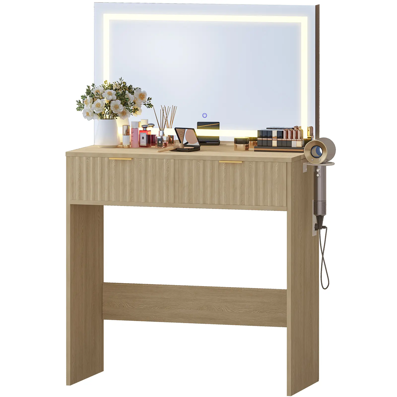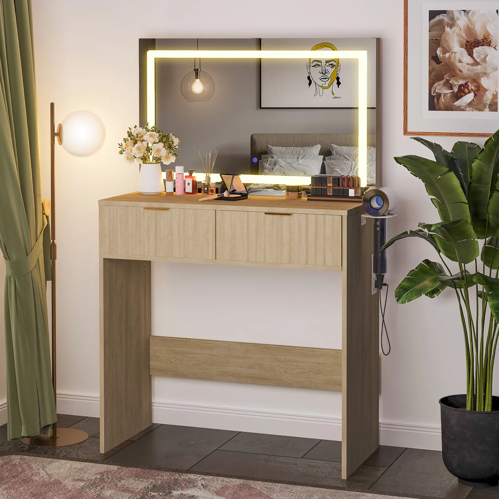 ·Integrated Power & Convenience: Built-in power outlets and USB ports allow you to easily power your beauty devices, phone, or tablet. The dedicated hair dryer rack keeps your styling tools tidy and accessible.