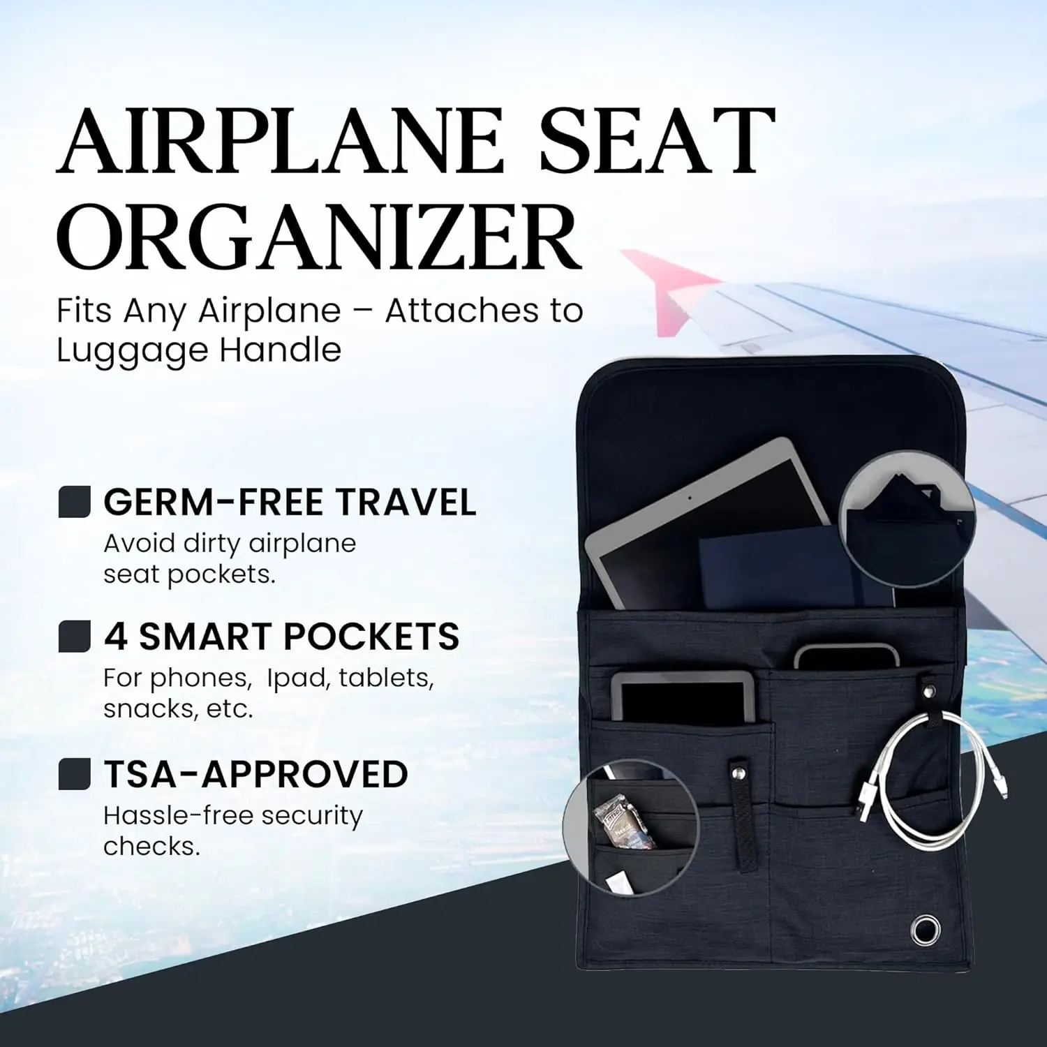 CLEAN, & HASSLE-FREE AIRPLANE TRAVEL: Keep your electronics and personal essentials out of filthy, germ-filled airplane seat pockets. this TSA-approved organizer is the top travel hack for a cleaner, comfier, stress-free flight.