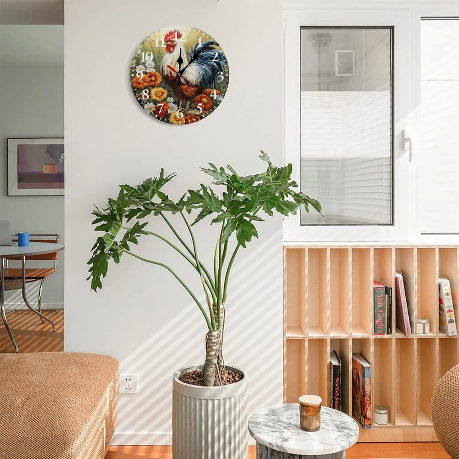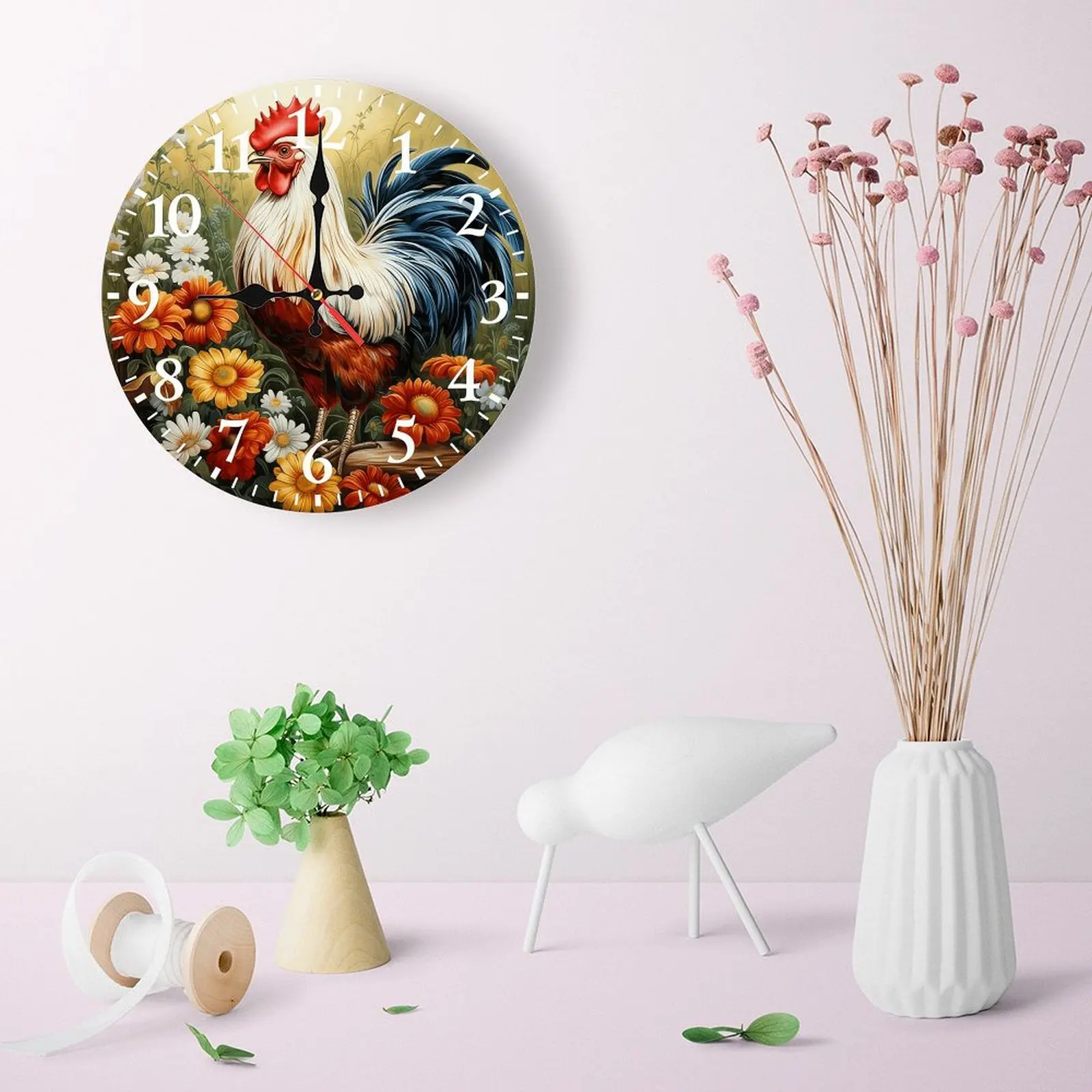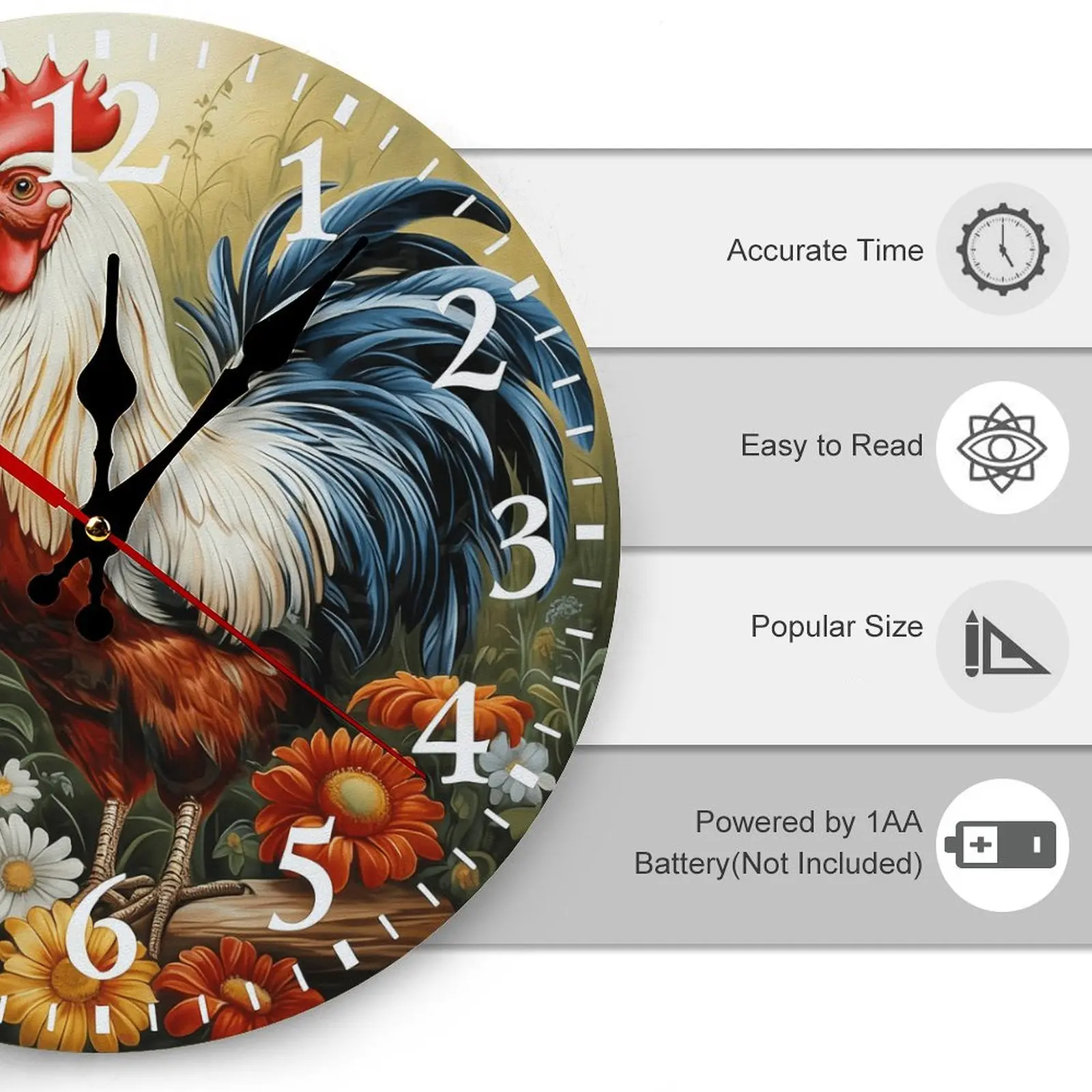 Vibrant Rooster & Wildflower Design: Detailed artistic illustration of a colorful rooster in a sunlit flower field creates a cheerful, nostalgic country vibe that complements any rustic decor