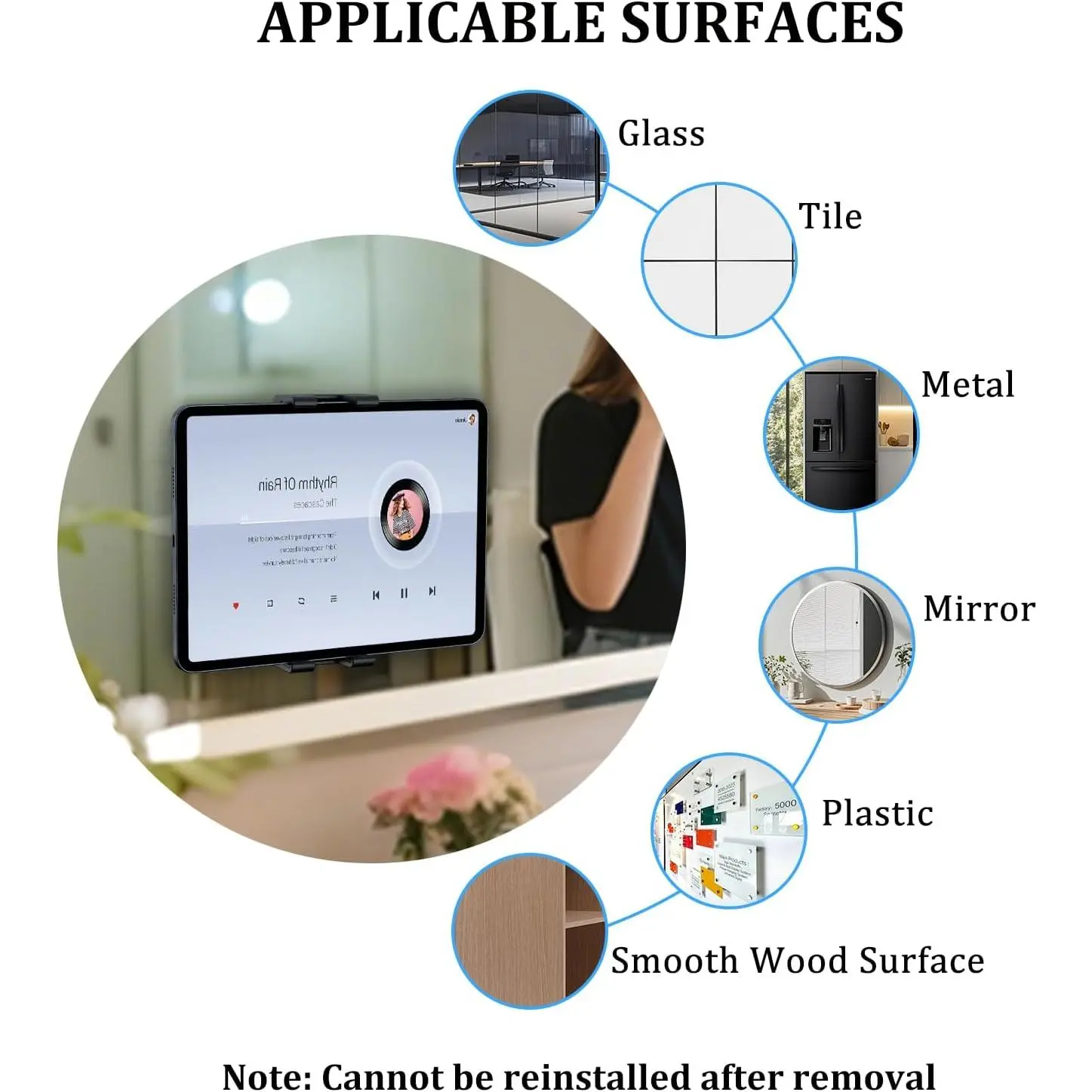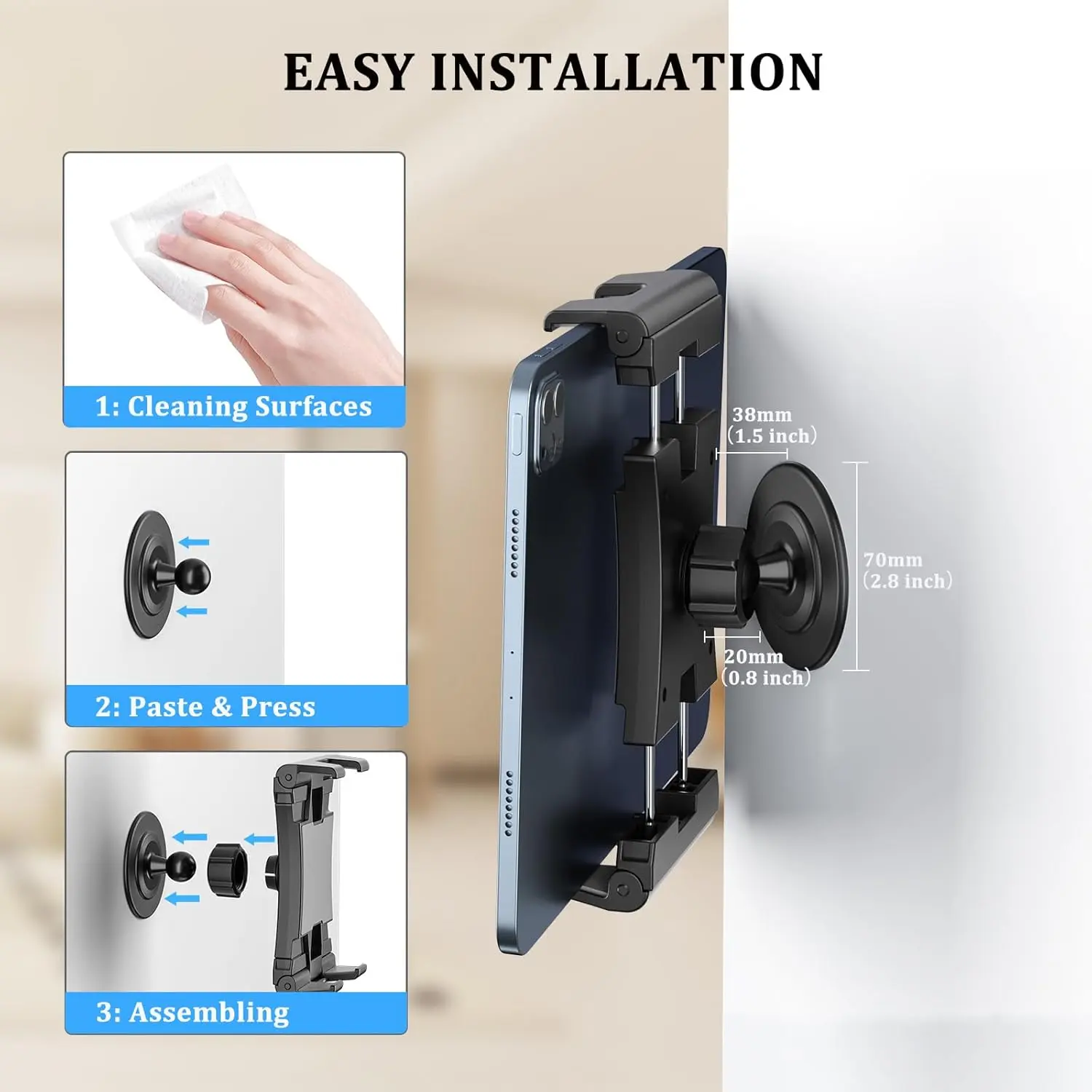 ideal for long-term setups on tile, glass, or smooth walls.Warning: Permanent tablet wall mount Before installation, please carefully confirm the position before pasting and installing.(Note: The pasting location must be a smooth surface)