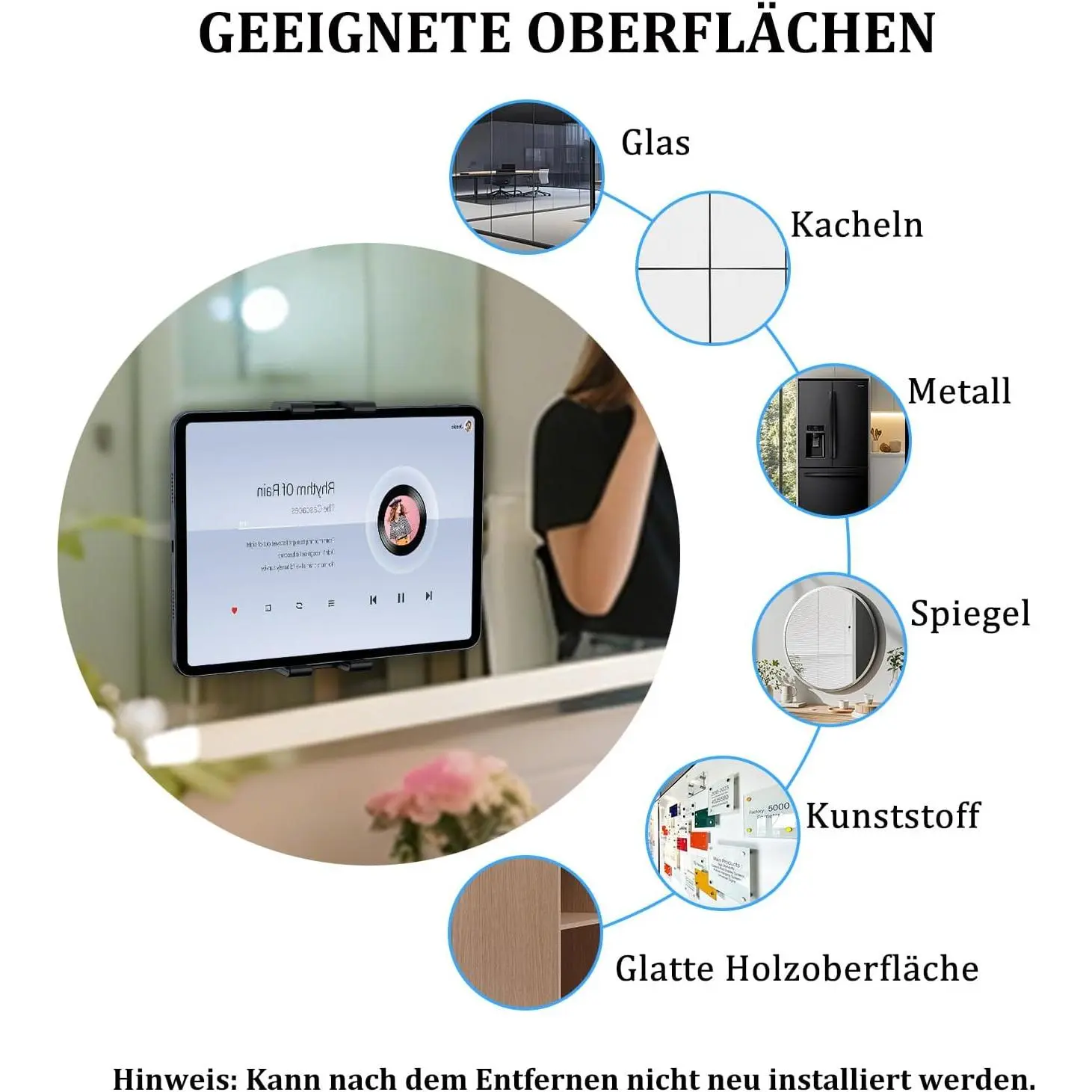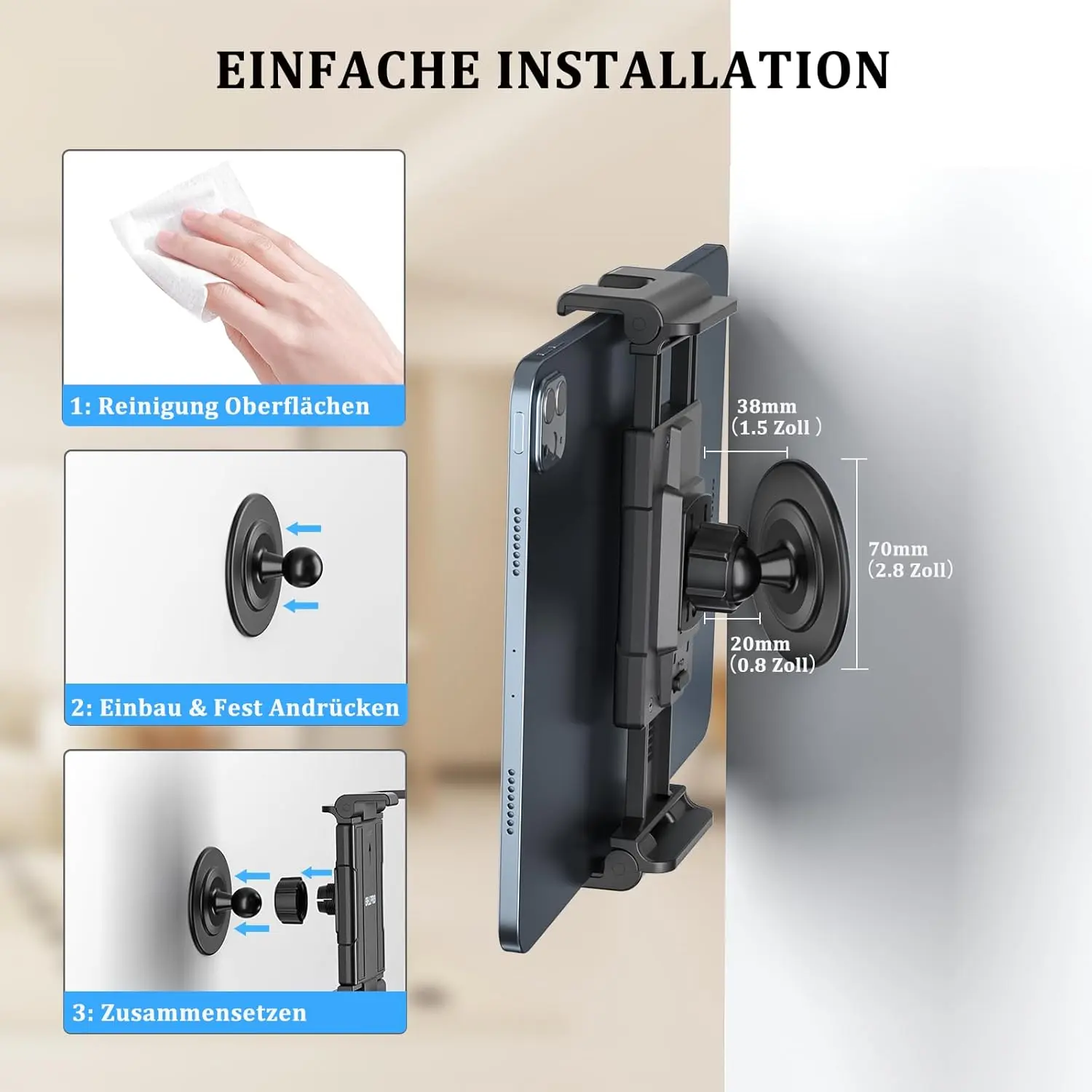 The iPad wall mount uses an industrial-quality 3M adhesive base, making it quick and easy to install.