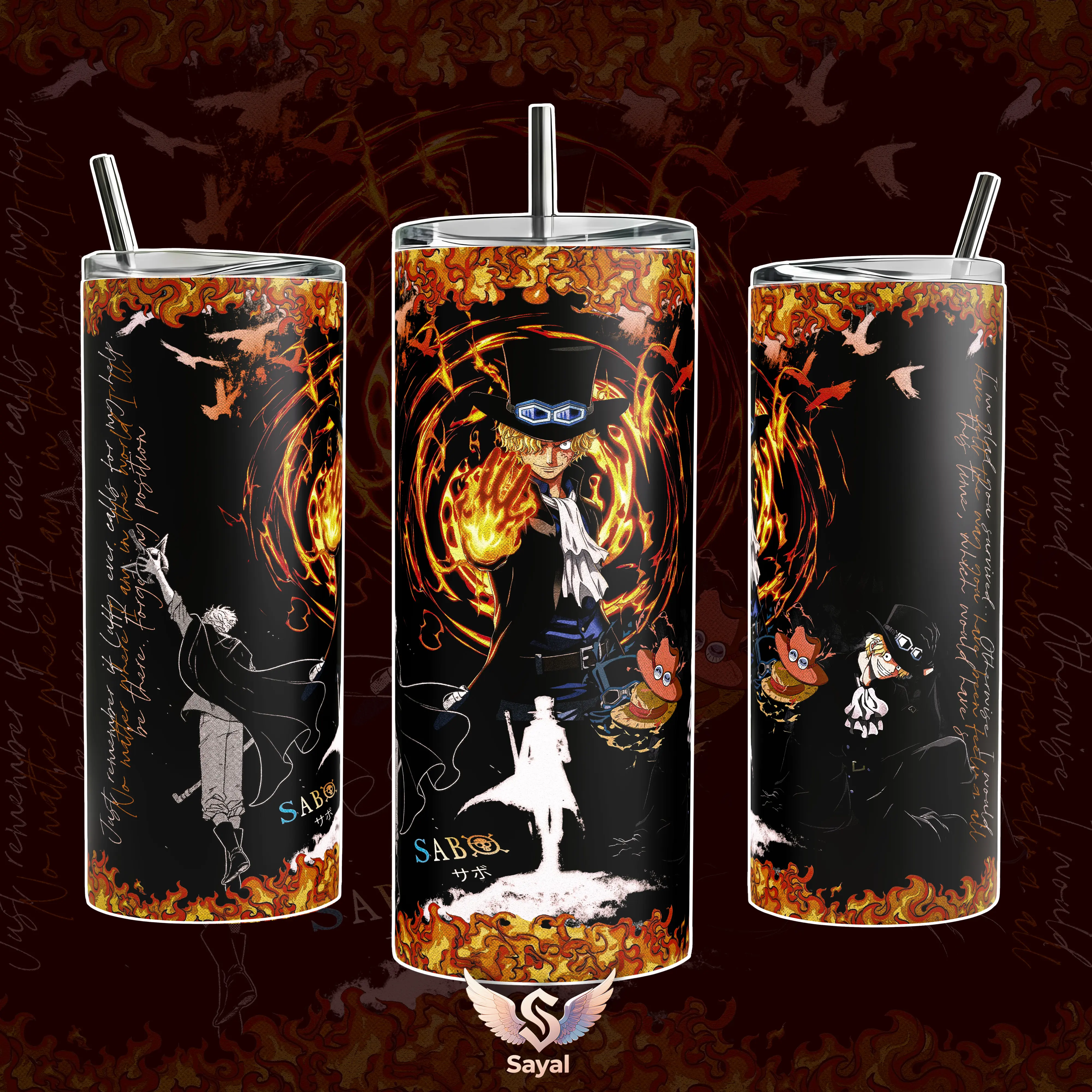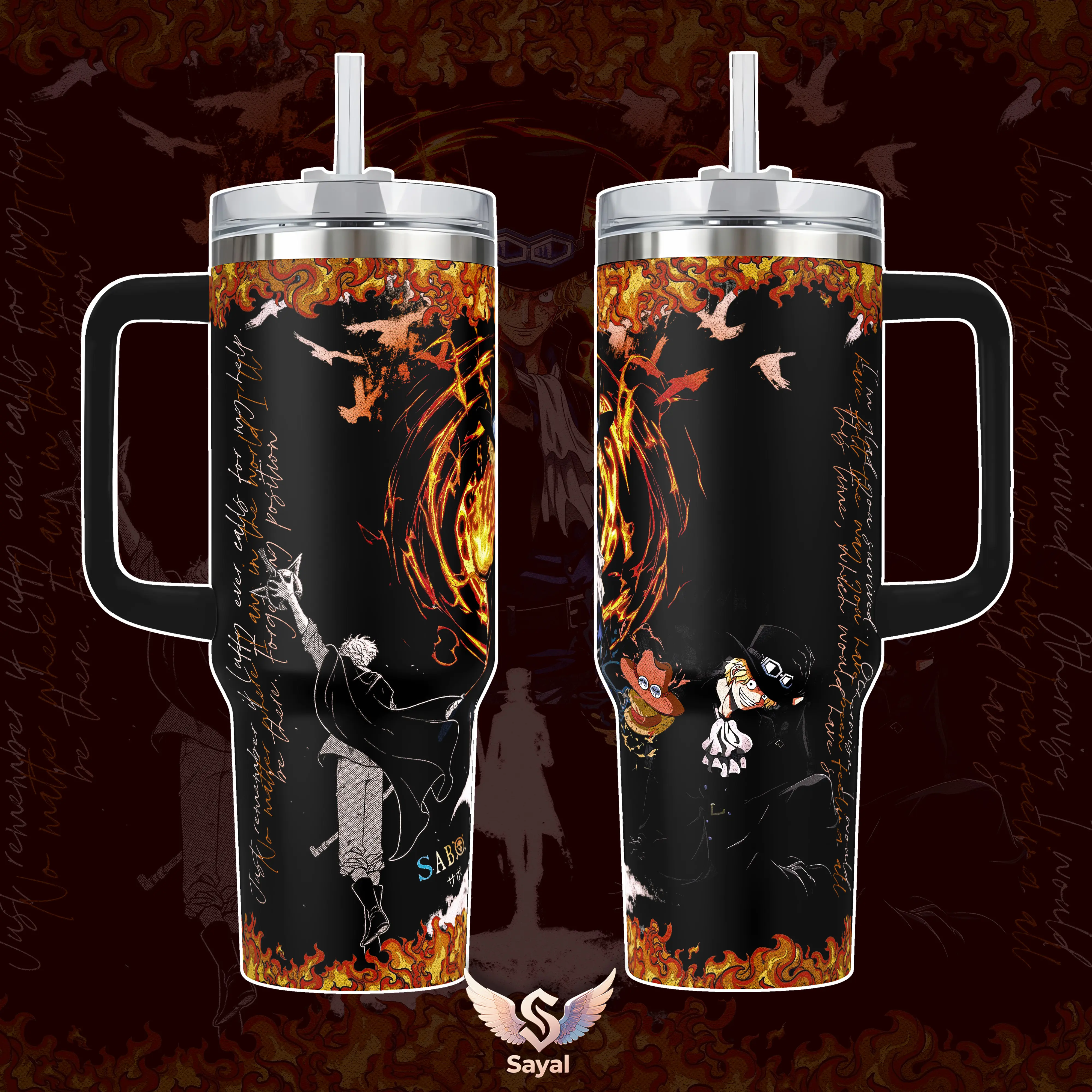 Sabo Fire Fist One P Revolutionary Army ASCE 40 oz Vacuum Insulated Tumbler with Handle Mera Mera no Mi Flame Graphic Design Keeps Drinks Hot/Cold 12H+, 18/8 Stainless Steel Travel Mug for Fans Manga Lovers Anime Merch Gift