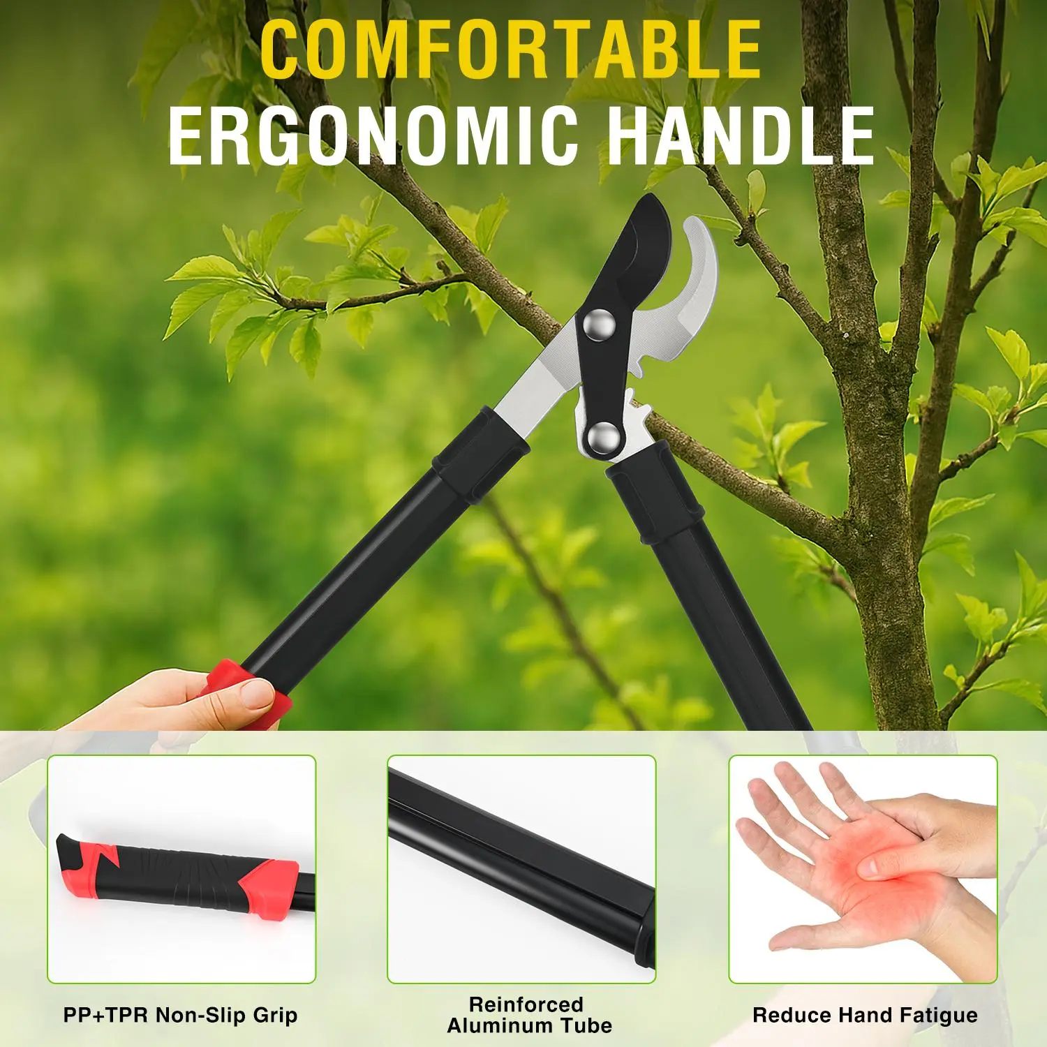 ·COMFORTABLE ERGONOMIC HANDLE: The ergonomically designed handle of this tree branch cutter features a reinforced aluminum tube with a black oxide finish and a PP+TPR grip that perfectly fits the curve of your hand. The grip is comfortable and strong enough to withstand powerful force, making it easy to prune any branch. These balanced, powerful, and reliable garden loppers will quickly become your best friend in the garden