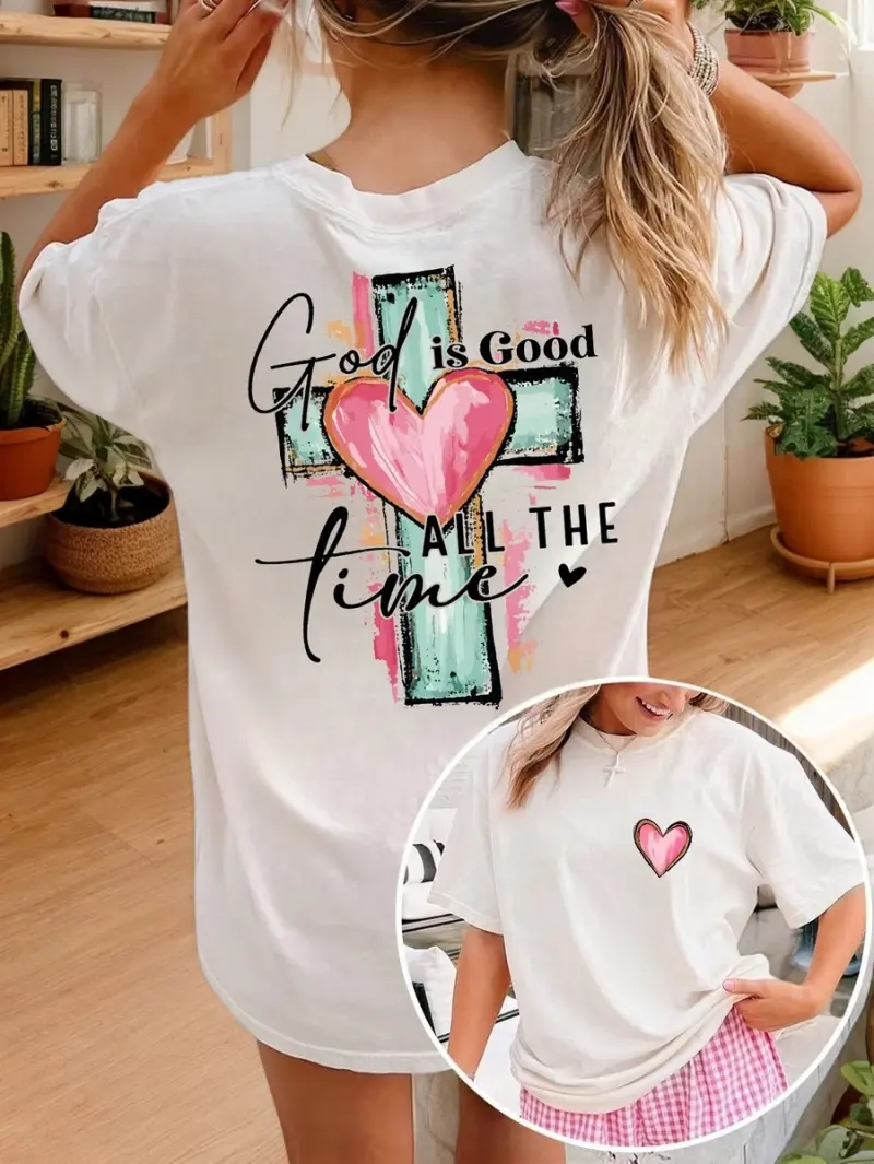 Christian "God Is Always Good" Cross & Letter Print T-Shirt, Casual Short Sleeve Crew Neck Faith Apparel, Summer White