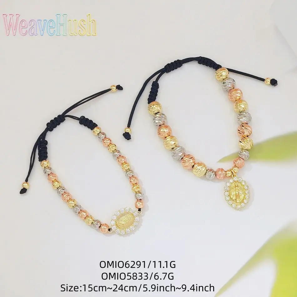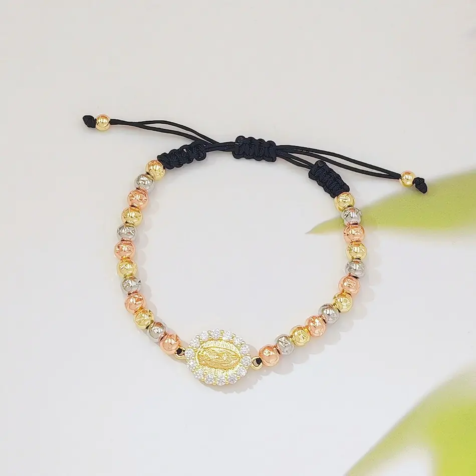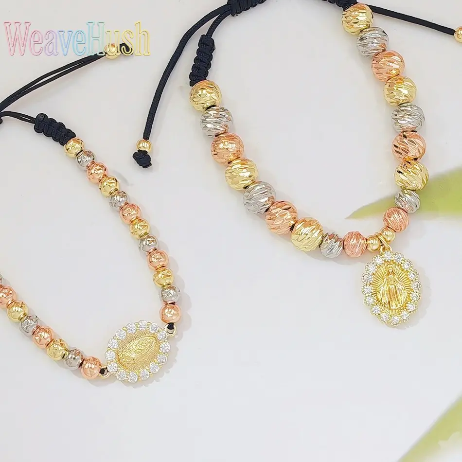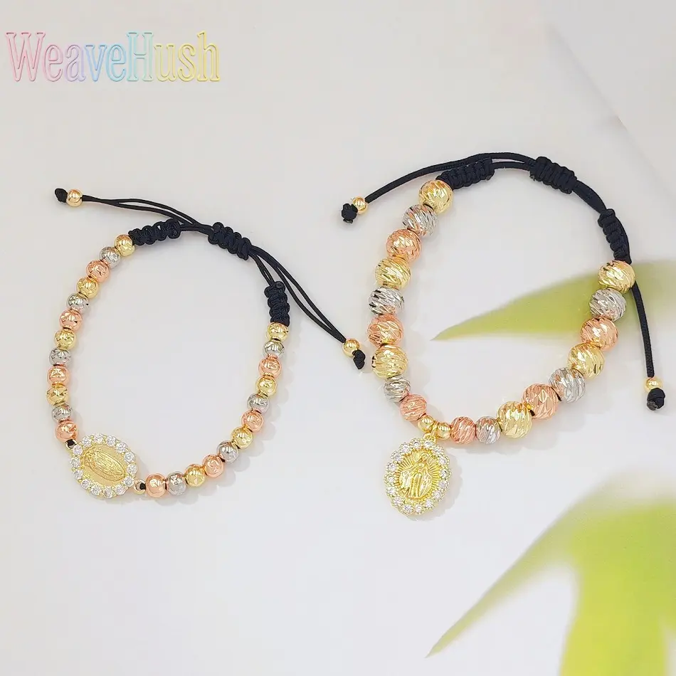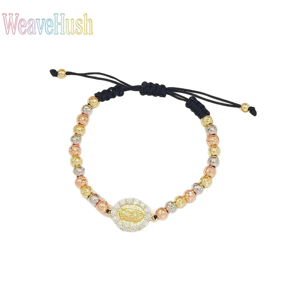 Tricolor Gold Virgin Mary Braided Bracelet, 18K Gold Plated Religious Beaded Adjustable Hand Rope, Catholic Faith Jewelry for Women, Vintage Inspired Spiritual Charm Bracelet, Perfect for Daily Wear, Prayer, Church & Sentimental Religious Gifting