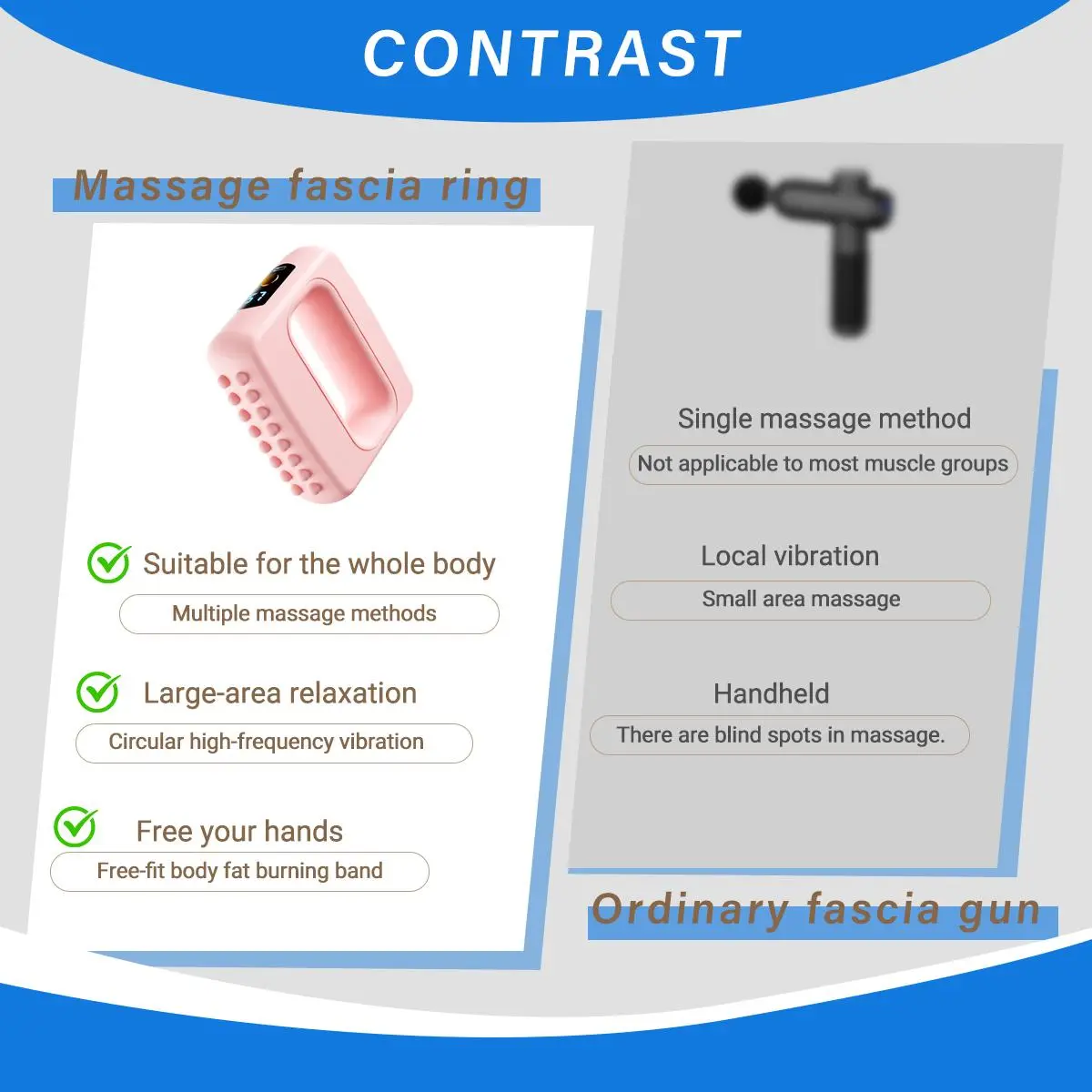 Full fitting: Hollow circular structure that can easily wrap around curved areas such as arms, legs, waist, and neck, solving the problem of blind spots that traditional fascia guns cannot cover