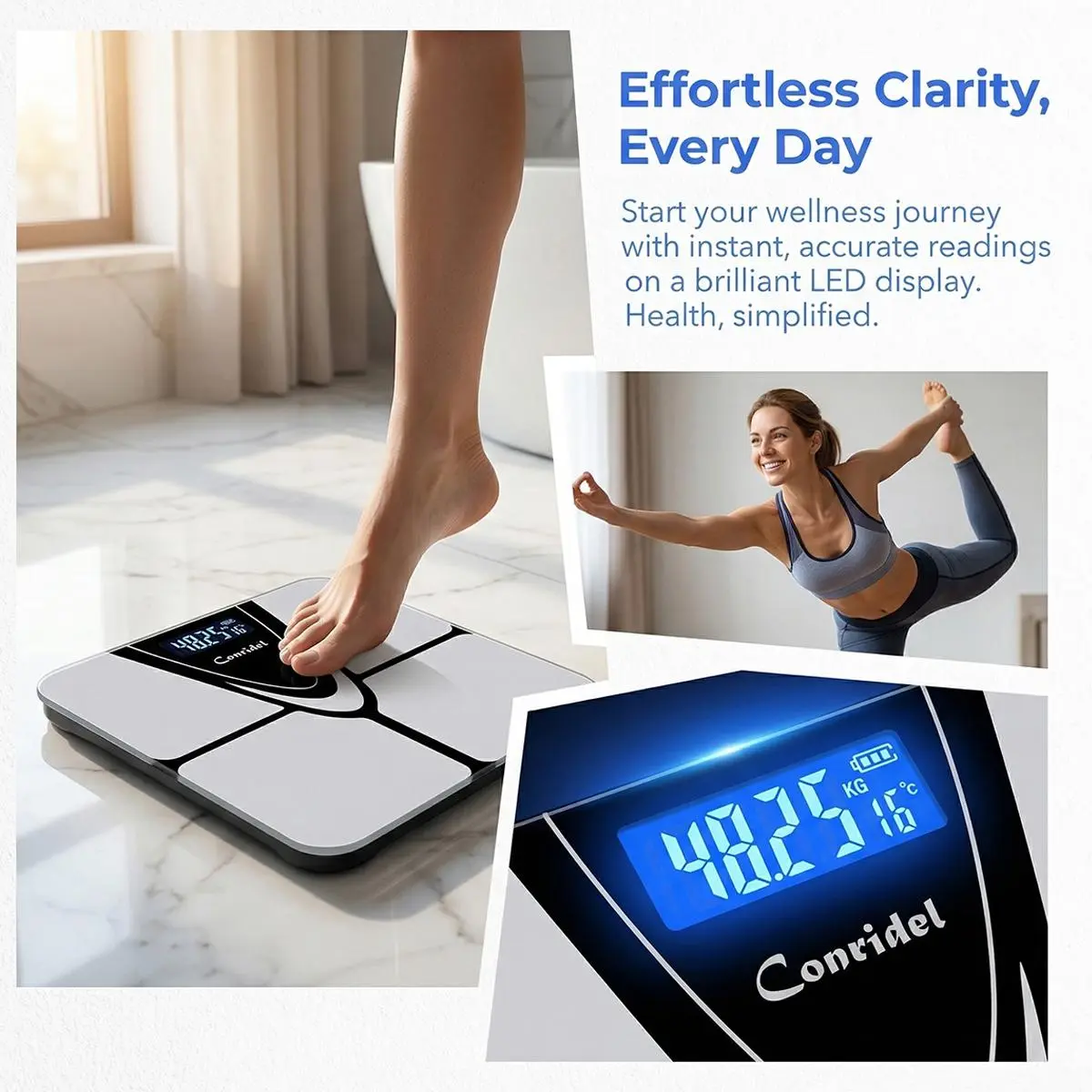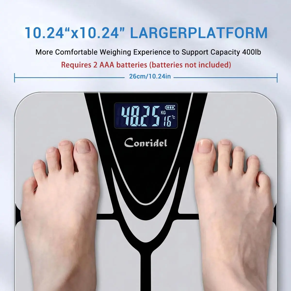 Adopting thickened carbon fiber I-shaped base and high-strength tempered glass panel, combined with anti slip safety design, the load-bearing capacity can reach 400lb (about 181kg); 10.24 "x 10.24" large-sized weighing platform for more comfortable standing; Equipped with an LCD backlit display screen, data is clear and easy to read, allowing for quick viewing even in dimly lit environments.