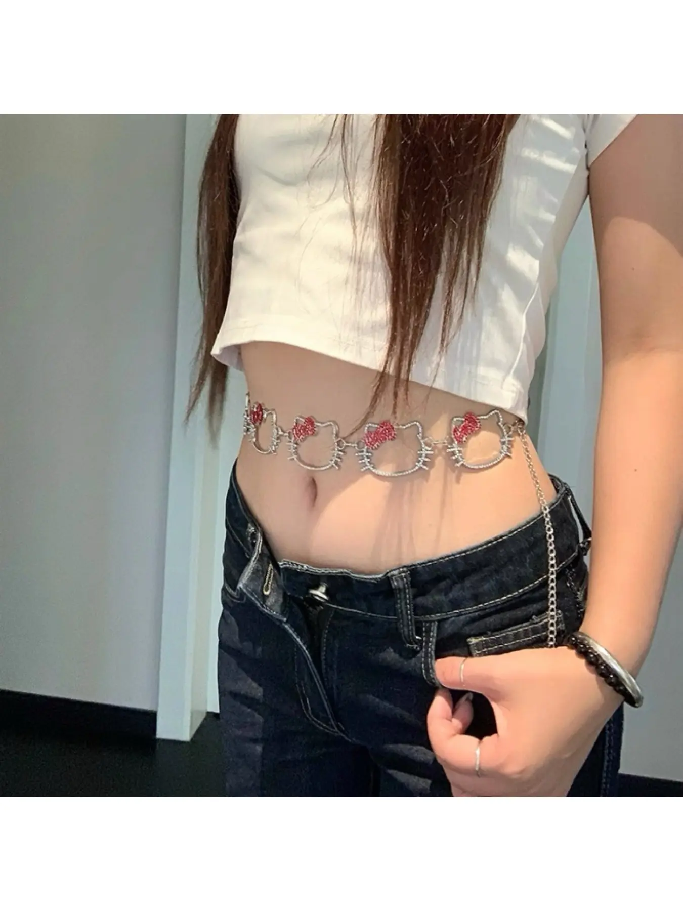 Sweet and cool girl cat waist chain, Y2K babe style metal belt with glittering diamonds, fashionable and unique accessory for skirts.