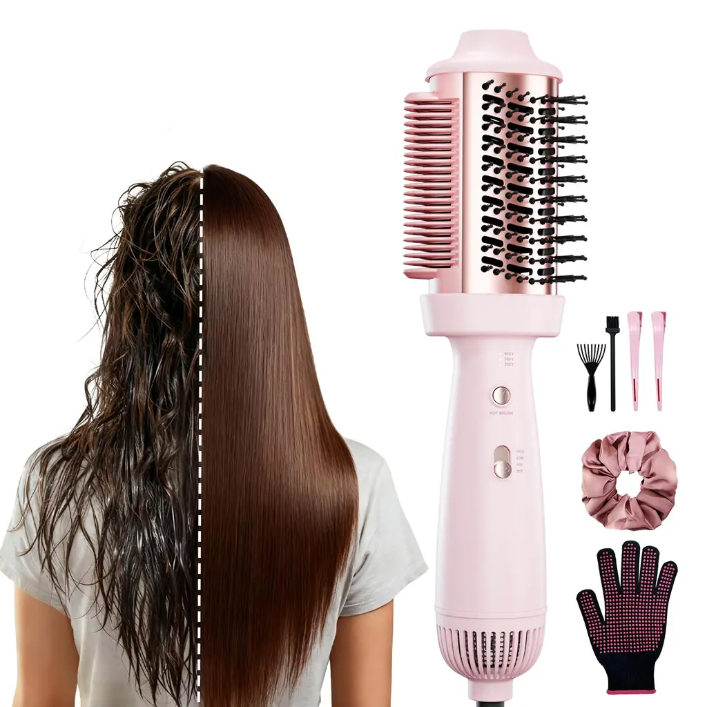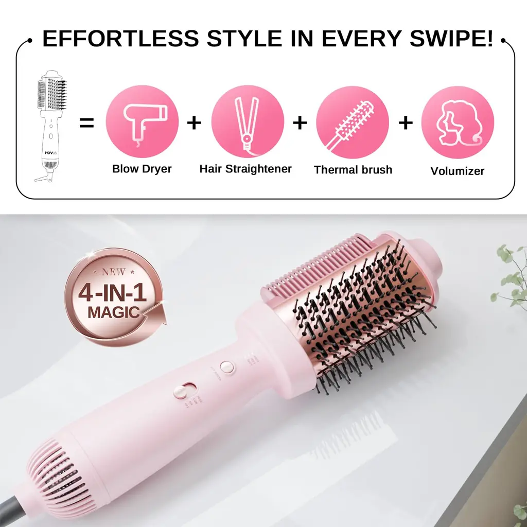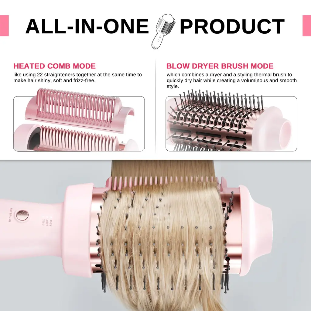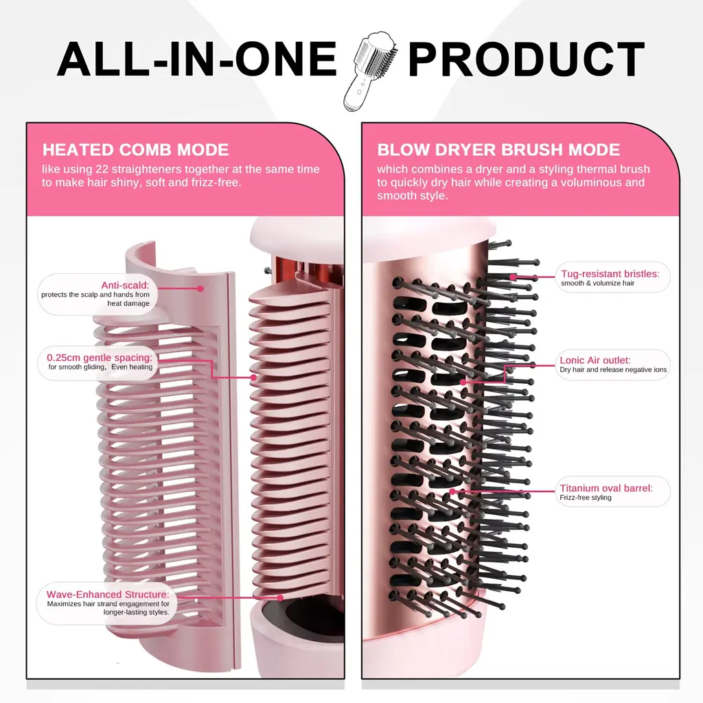 This 4-in-1 ionic hot air styler combines a blow dryer brush, hair straightener, thermal brush, and volumizer in one convenient tool. Designed with a titanium barrel, heated comb mode, and blow dryer brush mode, it helps dry, smooth, straighten, and volumize hair while reducing frizz. Suitable for wet, damp, or dry styling and ideal for a wide range of hair types.