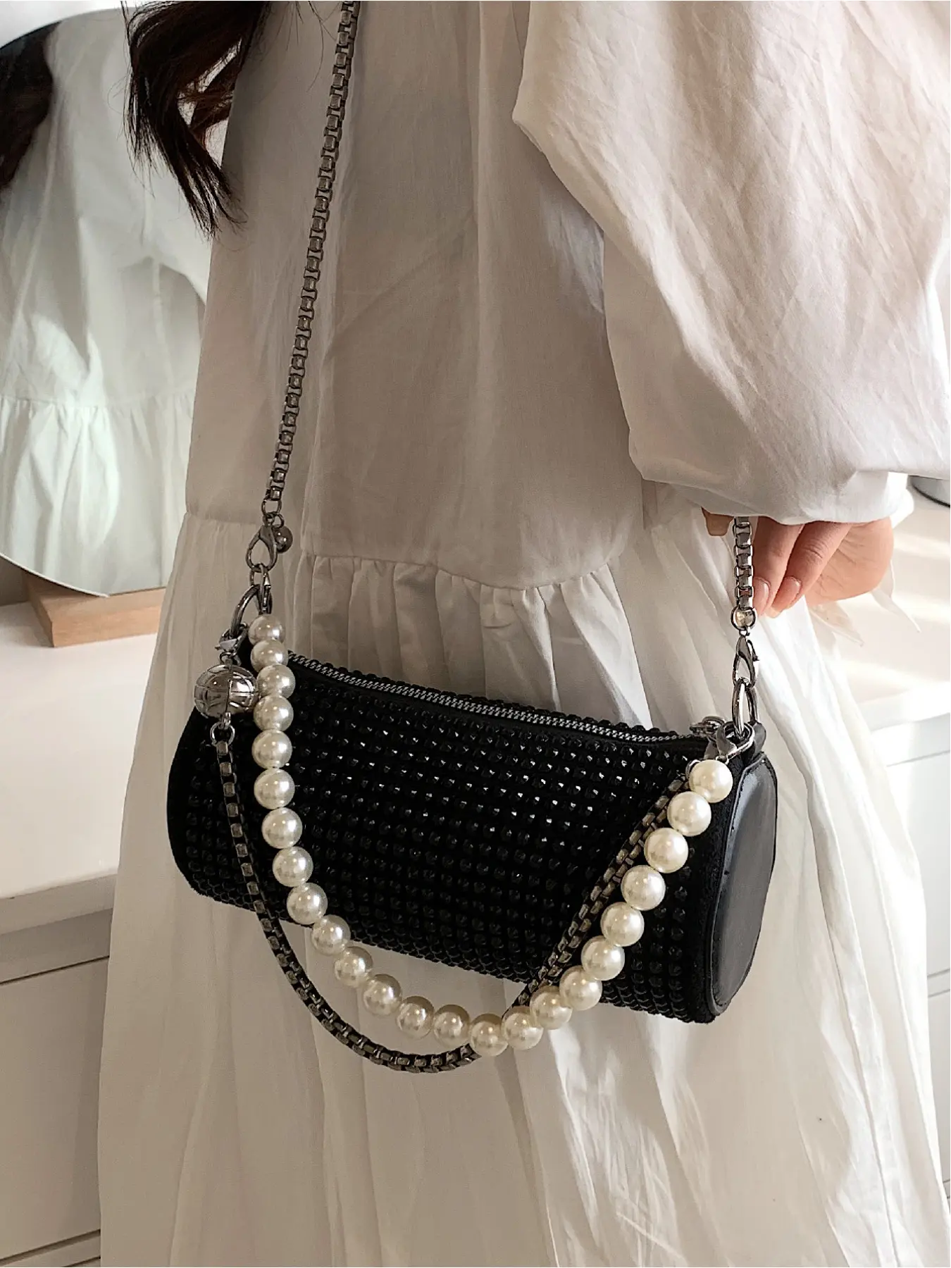 Elegant Rhinestone Design Handbag, Versatile Round Tube Bag, Simple Lady Shoulder Crossbody Bag, Stylish and Practical Accessory