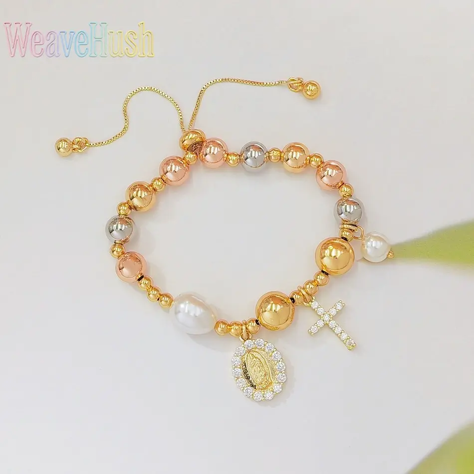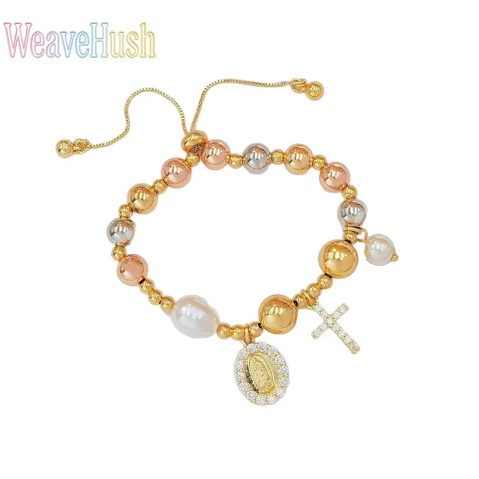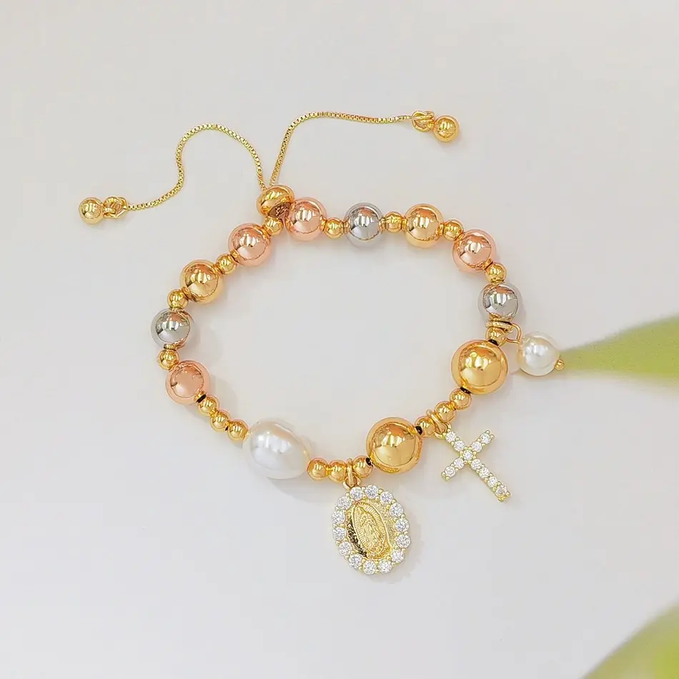 Hot-Selling Tricolor Gold Bead Virgin Mary Bracelet, Zircon Cross & Pearl Inlaid Religious Bracelet for Women, 18K Gold Plated Adjustable Catholic Faith Jewelry, Perfect for Daily Wear, Prayer, Church Occasions & Inspirational Religious Gifting