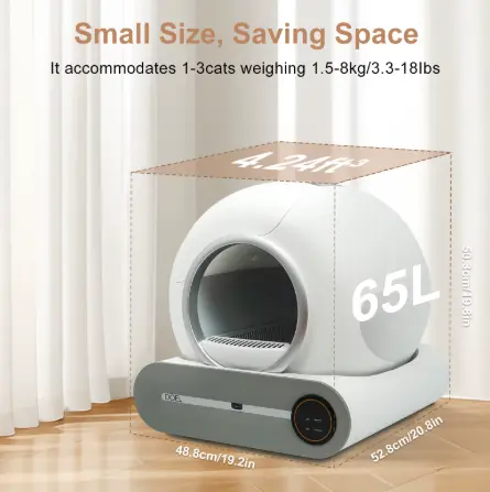 [Large Space] Totally 65L of toilet space and fecal collection space, yet only 4.24 cubic inches in size, this automatic litter box offers a spacious interior for cats weighing between 3.5lbs and 17lbs. The generous faecal collection space can support a 12lb cat for up to one week, so you can travel without worry.
