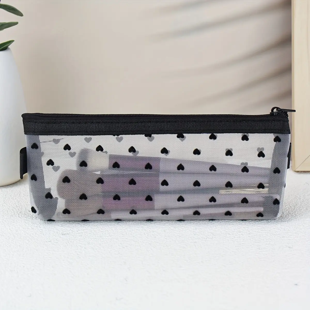 Fashionable Makeup Bag for Brushes, Beauty Tool Storage Pouch, Mesh Heart-Shaped Transparent Pencil Case