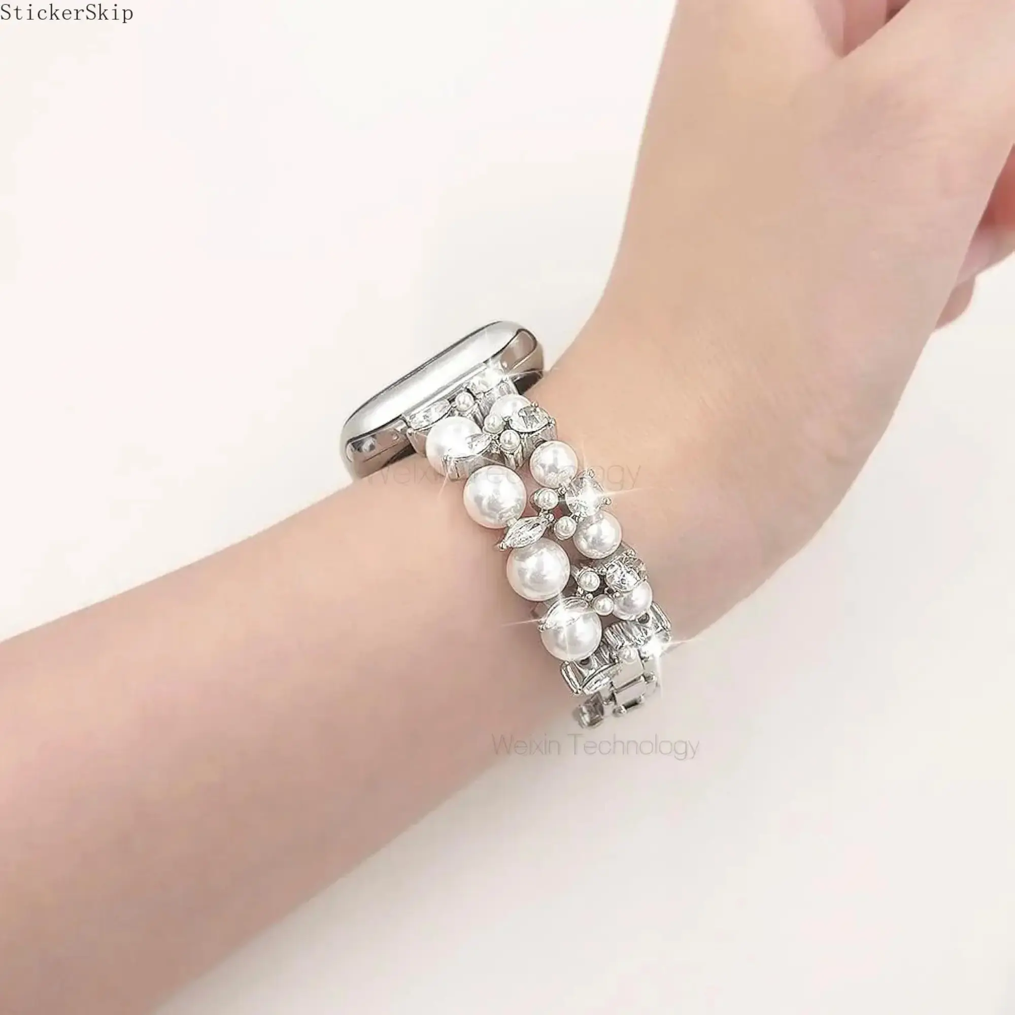 Brand new pearl beaded watch strap integrates graceful pearls and dazzling rhinestones, transforming your smartwatch into an exquisite jewelry accessory, ideal for women attending ceremonial events.